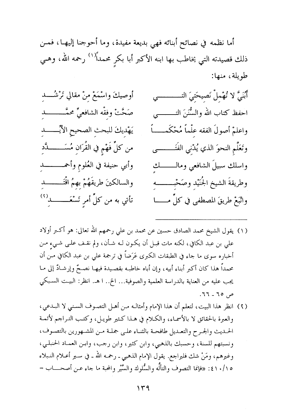 أما نظمه في نصائح أبنائه فهي بديعة مفيدة، وما أحوجنا إليها، فمن ذلك قصيدته التي يخاطب بها ابنه الأكبر أبا بكرٍ محمدًا (¬١) رحمه الله، وهي طويلة، منها: