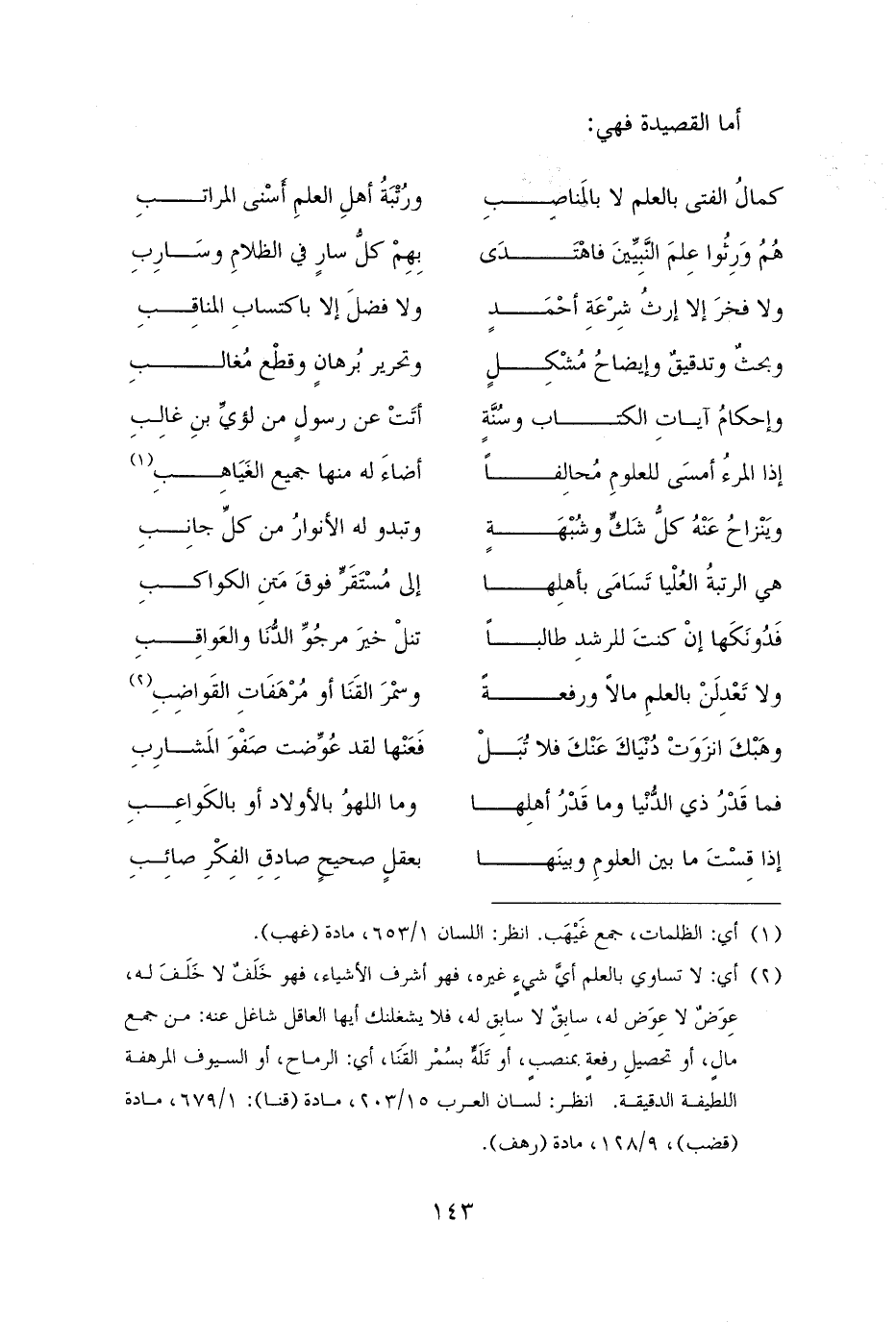 (¬٢) أي: لا تساوي بالعلم أيَّ شيءٍ غيره، فهو أشرف الأشياء، فهو خَلَفٌ لا خَلَفَ له، عِوَضٌ لا عِوَض له، سابِقٌ لا سابِق له، فلا يشغلنك أيها العاقل شاغل عنه: من جمع مالٍ، أو تحصيلِ رفعةٍ بمنصبٍ، أو تَلَهٍّ بسُمْر القَنَا، أي: الرماح، أو السيوف المرهفة اللطيفة الدقيقة. انظر: لسان العرب ١٥/ ٢٠٣، مادة (قنا): ١/ ٦٧٩، مادة (قضب)، ٩/ ١٢٨، مادة (رهف).