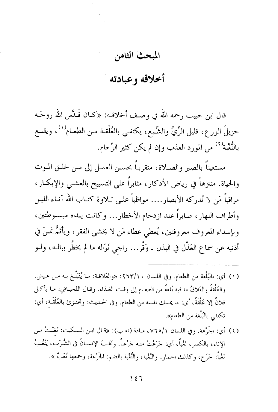 قال ابن حبيب رحمه الله في وصف أخلاقه: "كان قَدَّس الله روحَه جزيلَ الورع، قليل الرِّيِّ والشِّبع، يكتفي بالعُلْقة من الطعام (¬١)، ويقنع بالنُّغْبة (¬٢) من المورد العذب وإن لم يكن كثير الزِّحام.