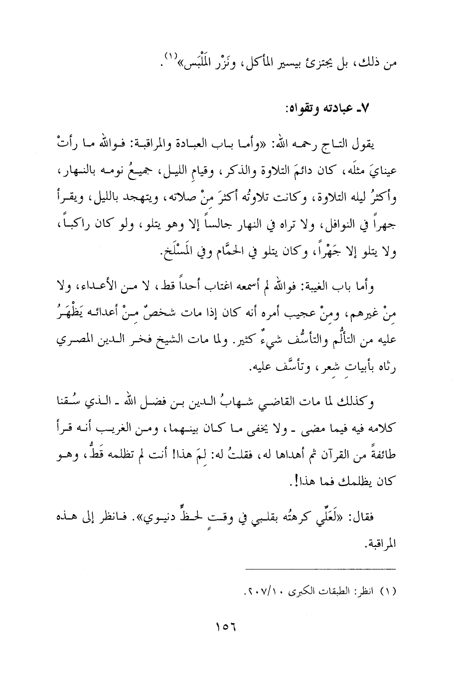 يقول التاج رحمه الله: "وأما باب العبادة والمراقبة: فوالله ما رأتْ عينايَ مثلَه، كان دائمَ التلاوة والذكر، وقيامِ الليل، جميعُ نومه بالنهار، وأكثرُ ليله التلاوة، وكانت تلاوتُه أكثرَ مِنْ صلاته، ويتهجد بالليل، ويقرأ جهرًا في النوافل، ولا تراه في النهار جالسًا إلا وهو يتلو، ولو كان راكبًا، ولا يتلو إلا جَهْرًا، وكان يتلو في الحمَّام وفي المَسْلَخ.