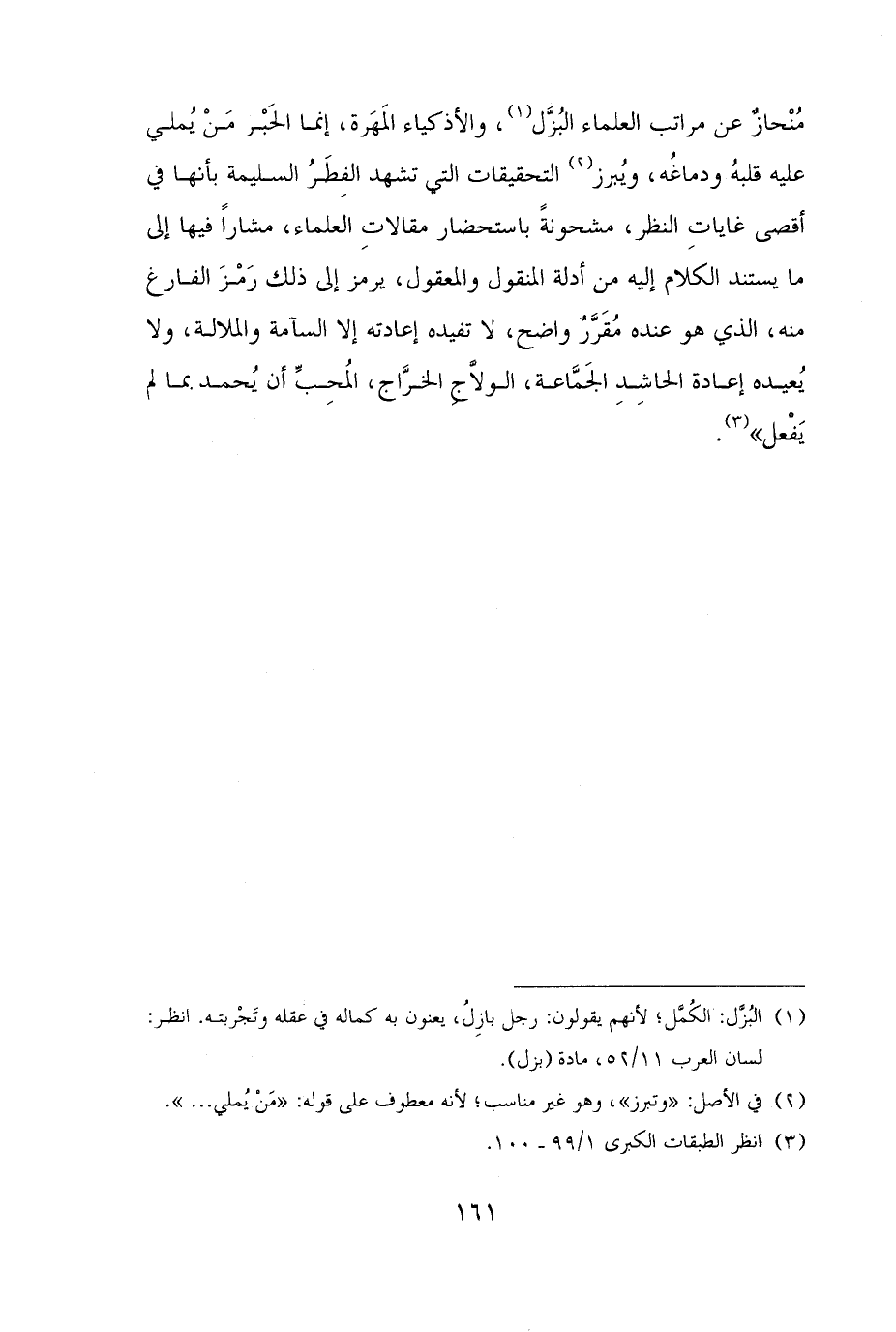 مُنْحازٌ عن مراتب العلماء البُزَّل (¬١)، والأذكياء المَهَرة، إنما الحَبْر مَنْ يُملي عليه قلبهُ ودماغُه، ويُبرز (¬٢) التحقيقات التي تشهد الفِطَرُ السليمة بأنها في أقصى غاياتِ النظر، مشحونةً باستحضار مقالاتِ العلماء، مشارًا فيها إلى ما يستند الكلام إليه من أدلة المنقول والمعقول، يرمز إلى ذلك رَمْزَ الفارغ منه، الذي هو عنده مُقَرَّرٌ واضح، لا تفيده إعادته إلا السآمة والملالة، ولا يُعيده إعادة الحاشِدِ الجَمَّاعة، الولَّاجِ الخرَّاج، المُحِبِّ أن يُحمد بما لم يَفْعل" (¬٣).
