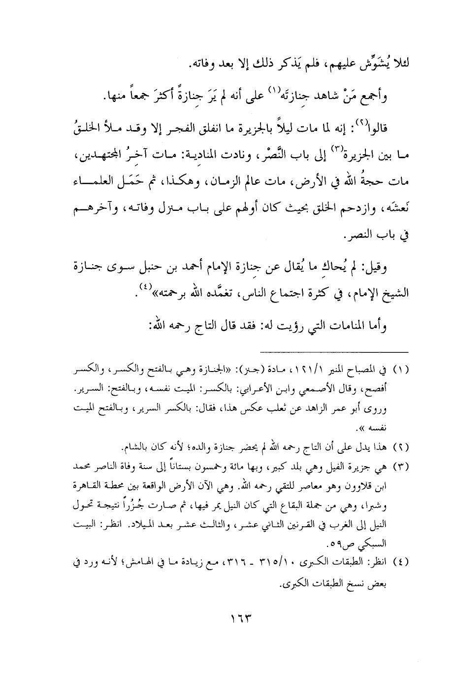 (¬٢) هذا يدل على أن التاج رحمه الله لم يحضر جنازة والده؛ لأنه كان بالشام.