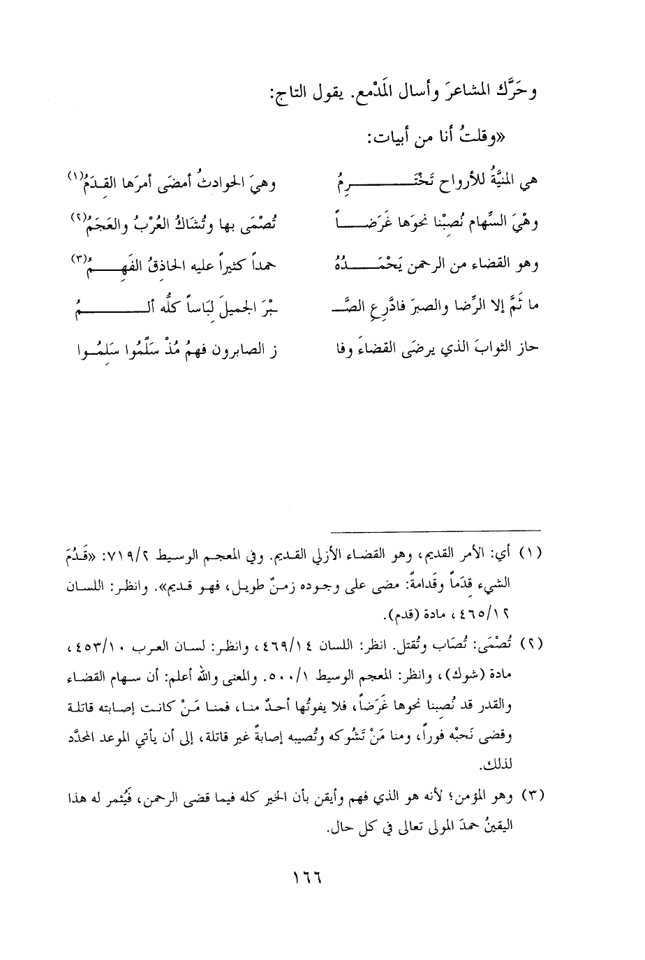 (¬٢) تُصْمَى: تُصَاب وتُقتل. انظر: اللسان ١٤/ ٤٦٩، وانظر: لسان العرب ١٠/ ٤٥٣، مادة (شوك)، وانظر: المعجم الوسيط ١/ ٥٠٠. والمعنى والله أعلم: أن سهام القضاء والقدر قد نُصِبنا نحوها غَرَضًا، فلا يفوتُها أحدٌ منا، فمنا مَنْ كانت إصابته قاتلة وقضى نَحبه فورًا، ومنا مَنْ تَشُوكه وتُصيبه إصابةً غير قاتلة، إلى أن يأتي الموعد المحدَّد لذلك.