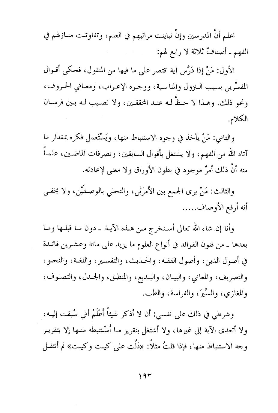 وشرطي في ذلك على نفسي: أن لا أذكر شيئًا أَعْلَمُ أني سُبقت إليه، ولا أتعدى الآية إلى غيرها، ولا أشتغل بتقرير ما أَسْتنبطه منها إلا بتقرير وجه الاستنباط منها، فإذا قلتُ مثلًا: "دَلَّت على كيت وكيت" لم أنتقل