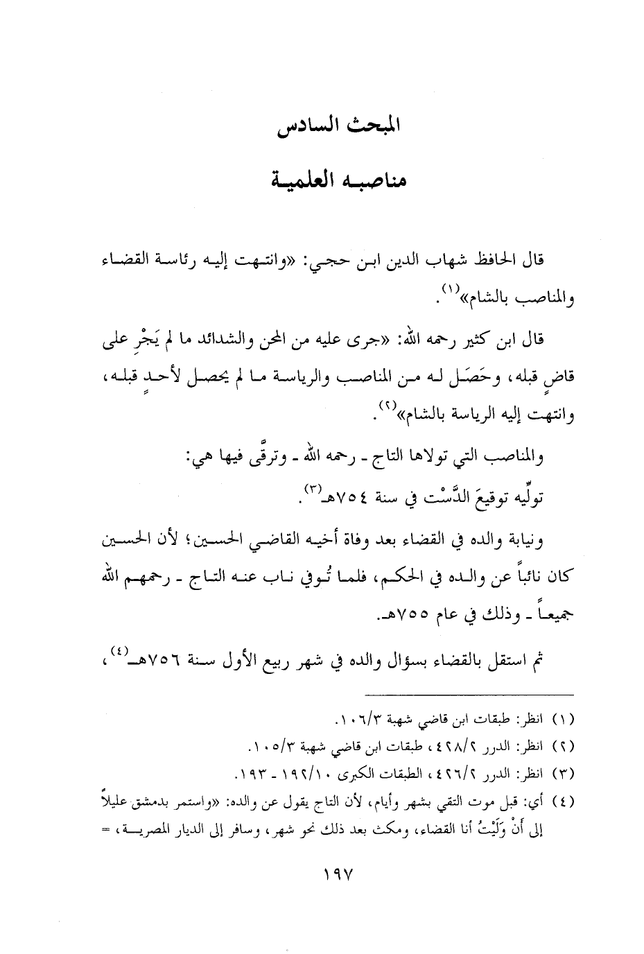 قال الحافظ شهاب الدين ابن حجي: "وانتهت إليه رئاسة القضاء والمناصب بالشام" (¬١).