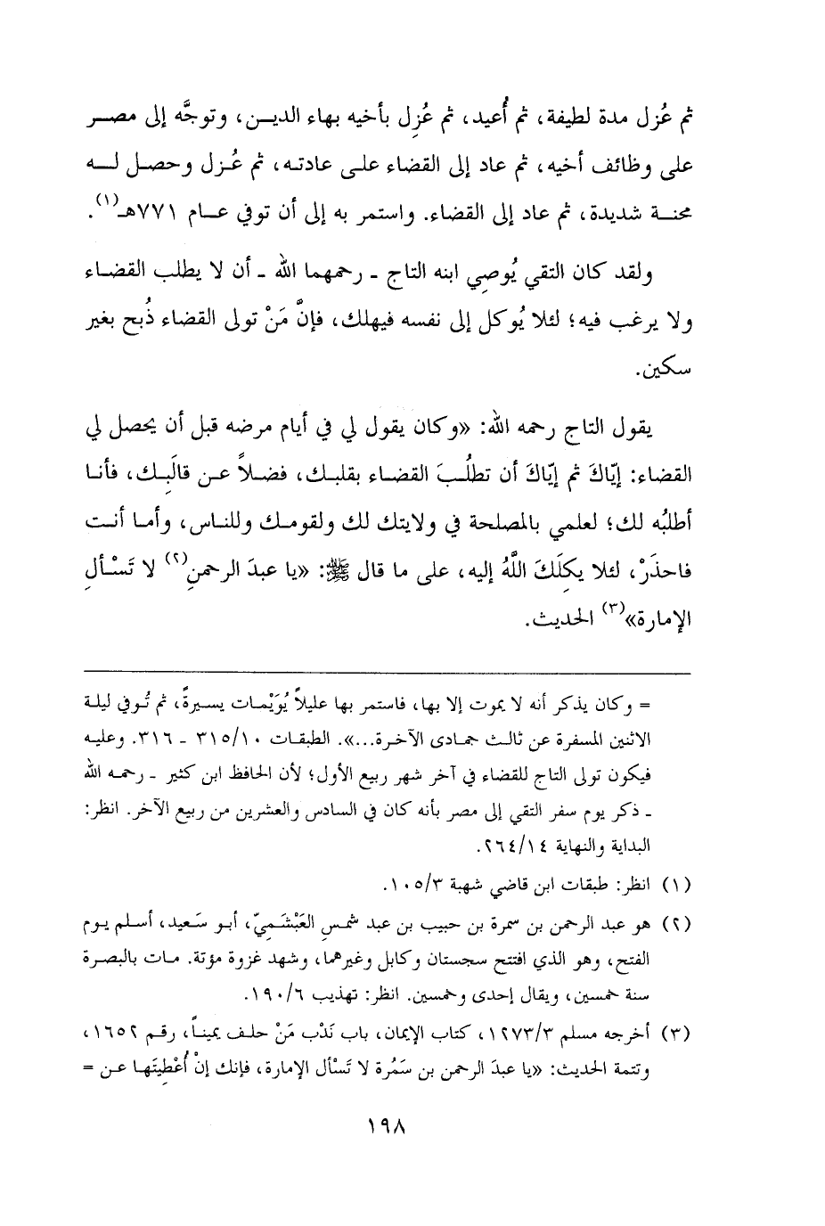 يقول التاج رحمه الله: "وكان يقول لي في أيام مرضه قبل أن يحصل لي القضاء: إيّاكَ ثم إيّاكَ أن تطلُبَ القضاء بقلبك، فضلًا عن قالَبِك، فأنا أطلبُه لك؛ لعلمي بالمصلحة في ولايتك لك ولقومك وللناس، وأما أنت فاحذَرْ، لئلا يكِلَكَ اللهُ إليه، على ما قال - صلى الله عليه وسلم -: "يا عبدَ الرحمنِ (¬٢) لا تَسْألِ الإمارة" (¬٣) الحديث.