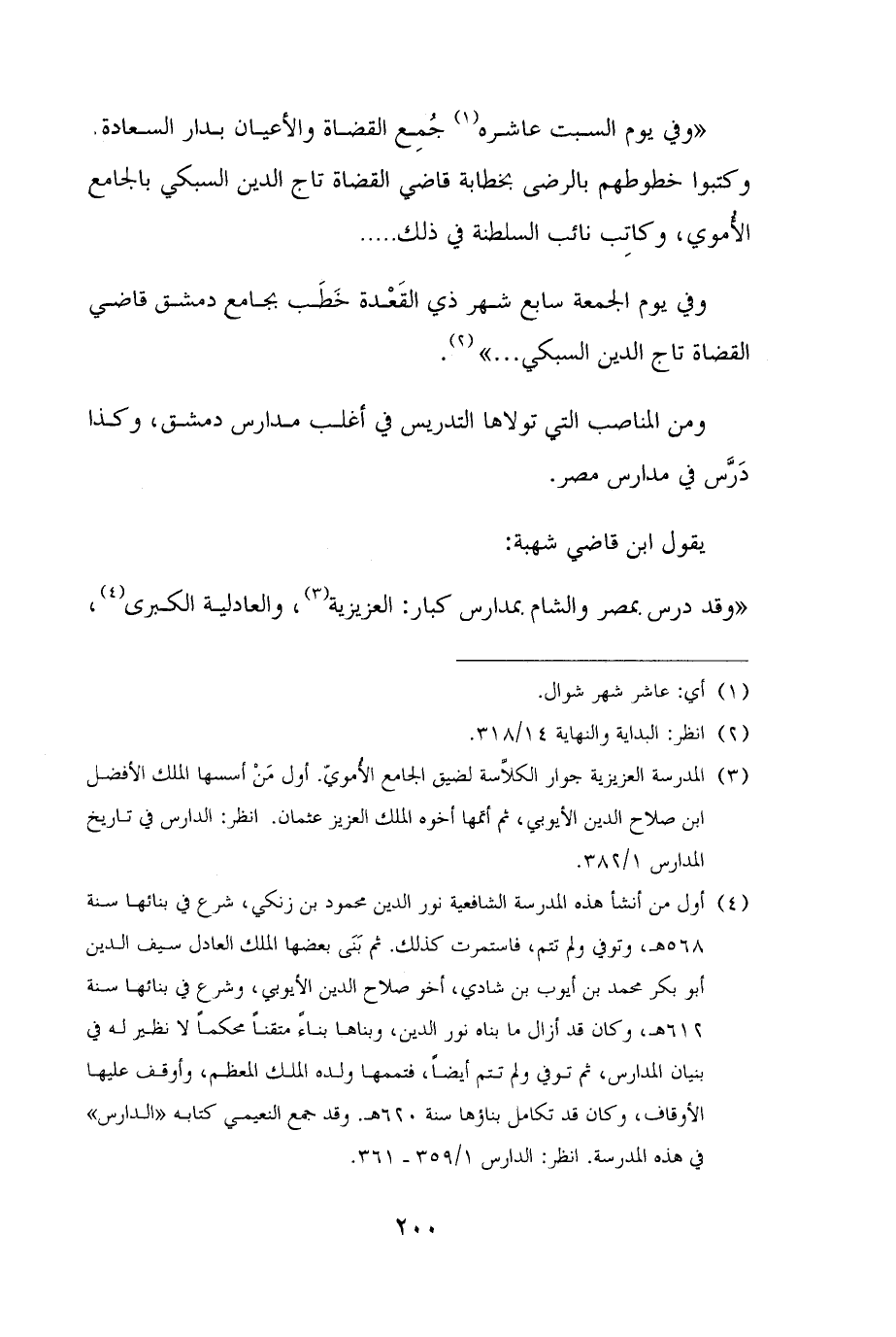 "وفي يوم السبت عاشره (¬١) جُمِع القضاة والأعيان بدار السعادة وكتبوا خطوطهم بالرضى بخطابة قاضي القضاة تاج الدين السبكي بالجامع الأُموي، وكاتِب نائب السلطنة في ذلك. . . . .