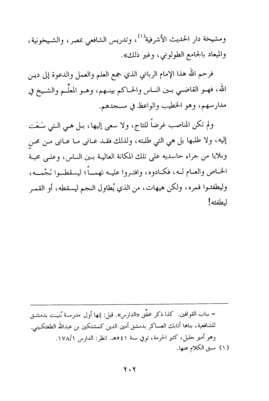 فرحم الله هذا الإمام الرباني الذي جمع العلم والعمل والدعوة إلى دين الله، فهو القاضي بين الناس والحاكم بينهم، وهو المعلِّم والشيخ في مدارسهم، وهو الخطيب والواعظ في مسجدهم.