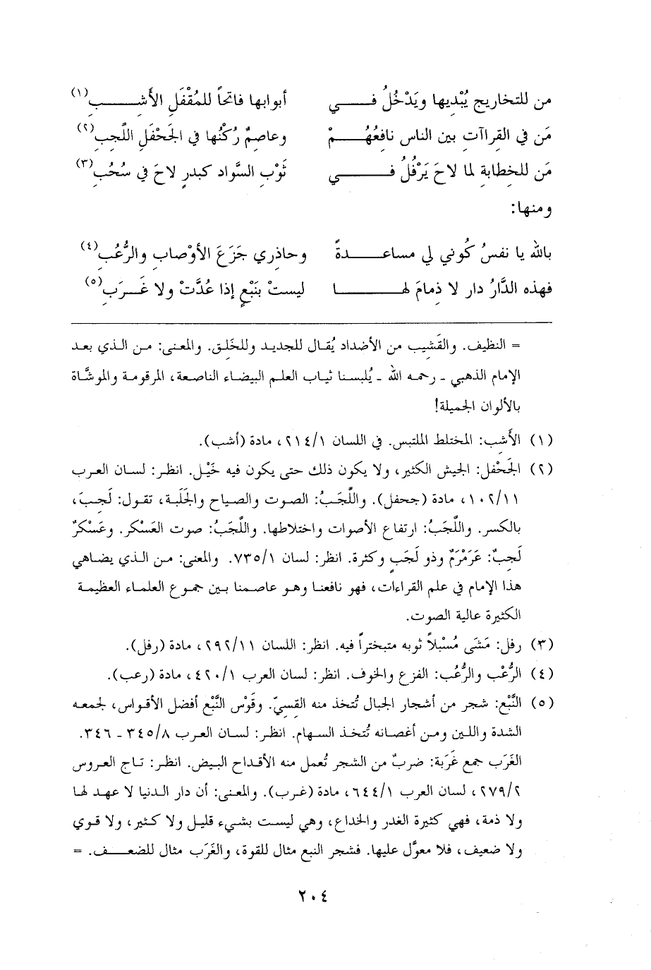 = النظيف. والقَشِيب من الأضداد يُقال للجديد وللخَلِق. والمعنى: من الذي بعد الإمام الذهبي - رحمه الله - يُلبسنا ثياب العلم البيضاء الناصعة، المرقومة والموشَّاة بالألوان الجميلة!