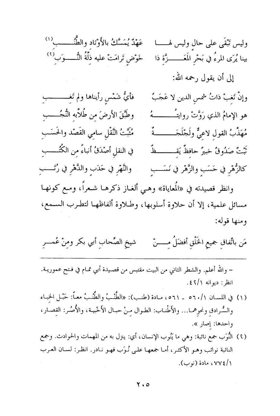 وليس تَبْقَى على حالٍ وليس لها ... عَهْدٌ يُمَسَّكُ بالأَوْتادِ والطُّنُبِ (¬١)