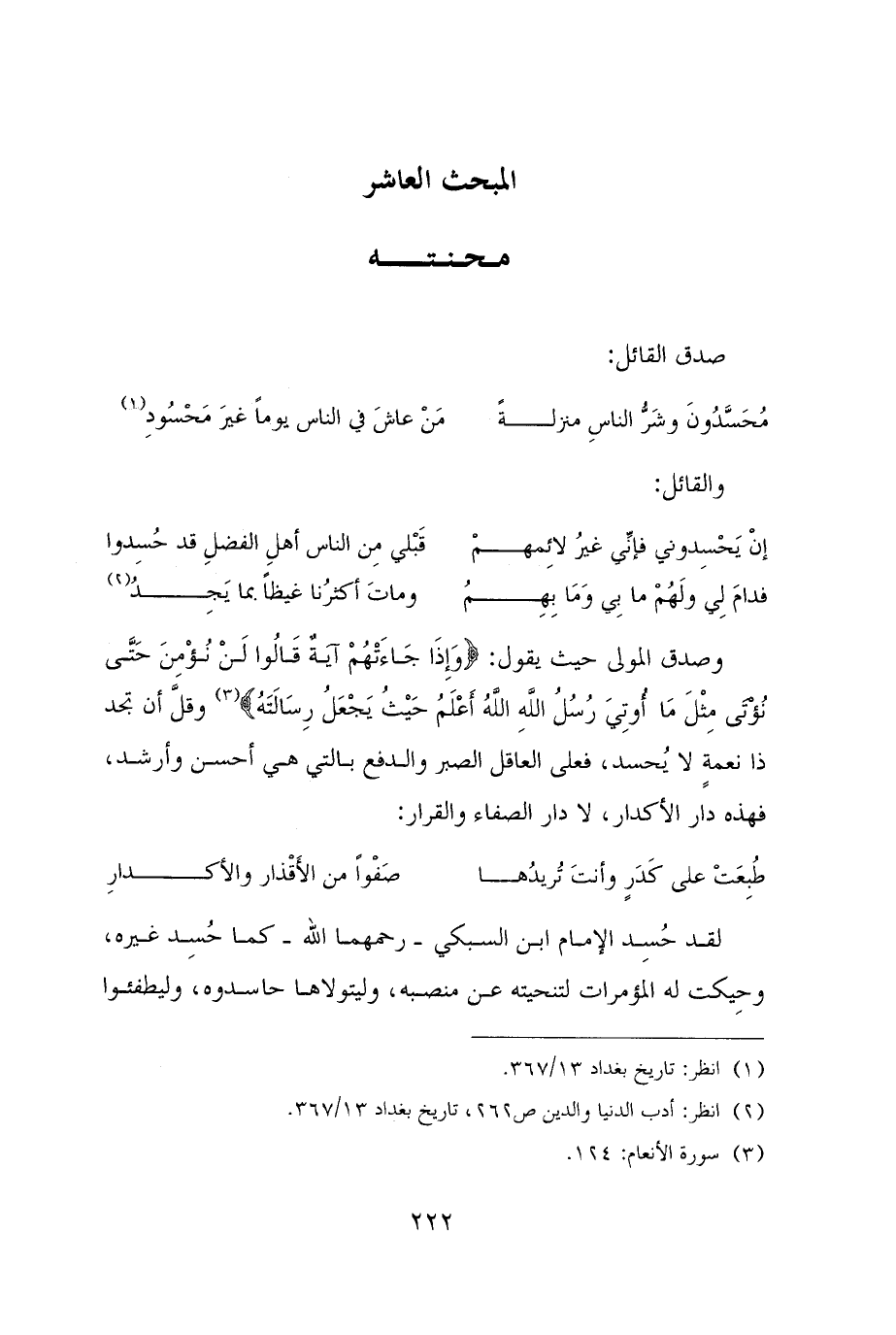 وصدق المولى حيث يقول: {وَإِذَا جَاءَتْهُمْ آيَةٌ قَالُوا لَنْ نُؤْمِنَ حَتَّى نُؤْتَى مِثْلَ مَا أُوتِيَ رُسُلُ اللَّهِ اللَّهُ أَعْلَمُ حَيْثُ يَجْعَلُ رِسَالَتَهُ} (¬٣) وقلَّ أن تجد ذا نعمةٍ لا يُحسد، فعلى العاقل الصبر والدفع بالتي هي أحسن وأرشد، فهذه دار الأكدار، لا دار الصفاء والقرار: