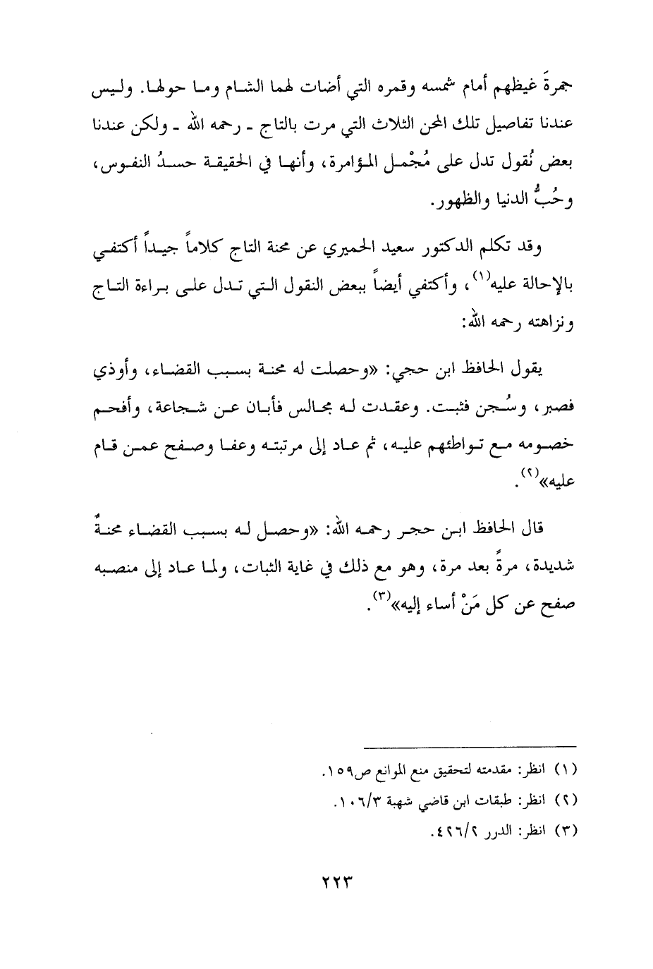 جمرةَ غيظهم أمام شمسه وقمره التي أضات لهما الشام وما حولها. وليس عندنا تفاصيل تلك المحن الثلاث التي مرت بالتاج - رحمه الله - ولكن عندنا بعض نُقول تدل على مُجْمل المؤامرة، وأنها في الحقيقة حسدُ النفوس، وحُبُّ الدنيا والظهور.