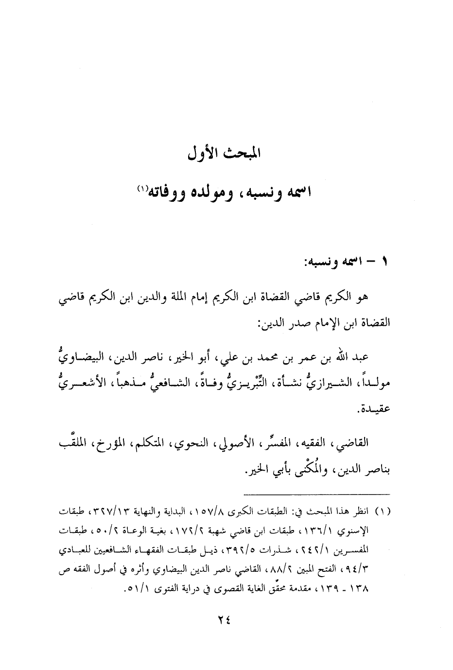 (¬١) انظر هذا المبحث في: الطبقات الكبرى ٨/ ١٥٧، البداية والنهاية ١٣/ ٣٢٧، طبقات الإسنوي ١/ ١٣٦، طبقات ابن قاضي شهبة ٢/ ١٧٢، بغية الوعاة ٢/ ٥٠، طبقات المفسرين ١/ ٢٤٢، شذرات ٥/ ٣٩٢، ذيل طبقات الفقهاء الشافعيين للعبادي ٣/ ٩٤، الفتح المبين ٢/ ٨٨، القاضي ناصر الدين البيضاوي وأثره في أصول الفقه ص ١٣٨ - ١٣٩، مقدمة محقِّق الغاية القصوى في دراية الفتوى ١/ ٥١.