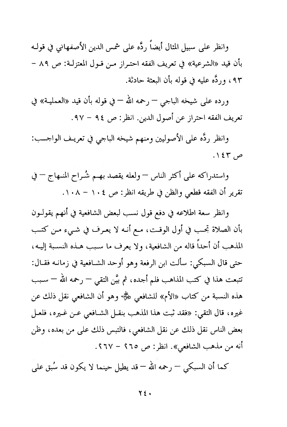 وانظر على سبيل المثال أيضًا ردَّه على شمس الدين الأصفهاني في قوله بأن قيد "الشرعية" في تعريف الفقه احتراز من قول المعتزلة: ص ٨٩ - ٩٣، وردَّه عليه في قوله بأن البعثة حادثة.