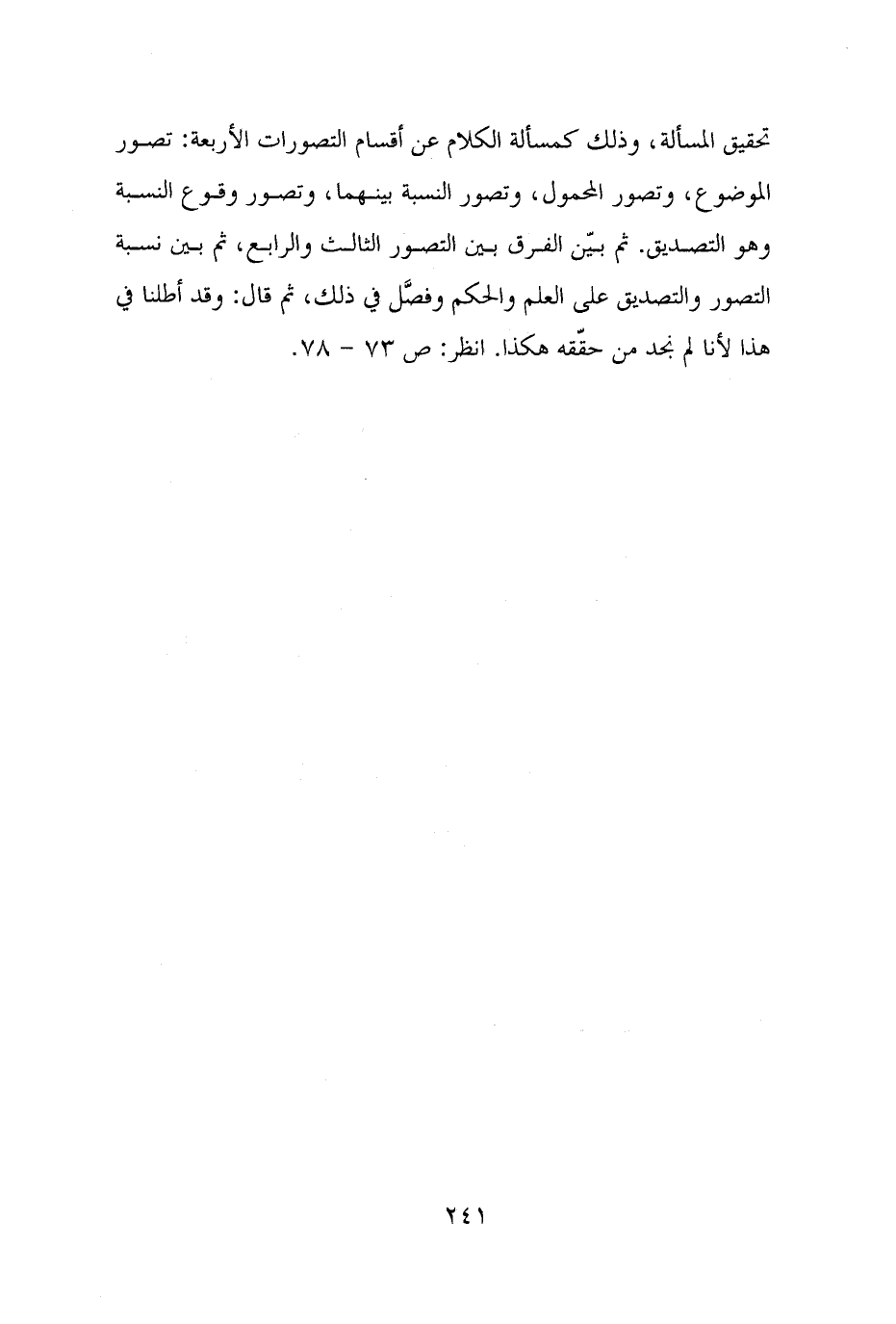 تحقيق المسألة، وذلك كمسألة الكلام عن أقسام التصورات الأربعة: تصور الموضوع، وتصور المحمول، وتصور النسبة بينهما، وتصور وقوع النسبة وهو التصديق. ثم بيّن الفرق بين التصور الثالث والرابع، ثم بين نسبة التصور والتصديق على العلم والحكم وفصَّل في ذلك، ثم قال: وقد أطلنا في هذا لأنا لم نجد من حقّقه هكذا. انظر: ص ٧٣ - ٧٨.