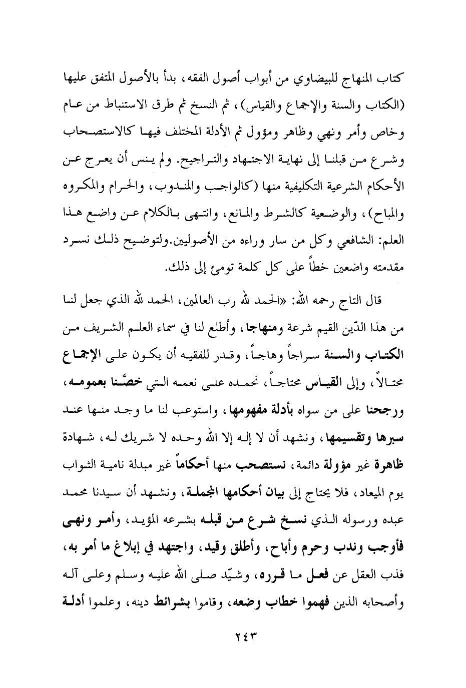 قال التاج رحمه الله: "الحمد لله رب العالمين، الحمد لله الذي جعل لنا من هذا الدّين القيم شرعة ومنهاجا، وأطلع لنا في سماء العلم الشريف من الكتاب والسنة سراجًا وهاجًا، وقدر للفقيه أن يكون على الإجماع محتالًا، وإلى القياس محتاجًا، نحمده على نعمه التى خصَّنا بعمومه، ورجحنا على من سواه بأدلة مفهومها، واستوعب لنا ما وجد منها عند سبرها وتقسيمها، ونشهد أن لا إله إلا الله وحده لا شريك له، شهادة ظاهرة غير مؤولة دائمة، نستصحب منها أحكامًا غير مبدلة نامية الثواب يوم الميعاد، فلا يحتاج إلى بيان أحكامها المجملة، ونشهد أن سيدنا محمد عبده ورسوله الذي نسخ شرع من قبله بشرعه المؤيد، وأمر ونهى فأوجب وندب وحرم وأباح، وأطلق وقيد، واجتهد في إبلاغ ما أمر به، فذب العقل عن فعل ما قرره، وشيّد صلى الله عليه وسلم وعلى آله وأصحابه الذين فهموا خطاب وضعه، وقاموا بشرائط دينه، وعلموا أدلة