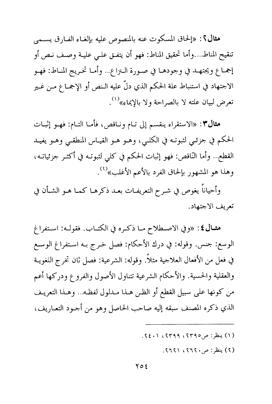 مثال ٢: "إلحاق المسكوت عنه بالمنصوص عليه بإلغاء الفارق يسمى تنقيح المناط. . . . وأما تحقيق المناط: فهو أن يتفق علي علية وصف نص أو إجماع ويجتهد في وجودها في صورة النزاع. . . وأما تخريج المناط: فهو الاجتهاد في استنباط علة الحكم الذي دلّ عليه النص أو الإجماع من غير تعرض لبيان علته لا بالصراحة ولا بالإيماء" (¬١).
