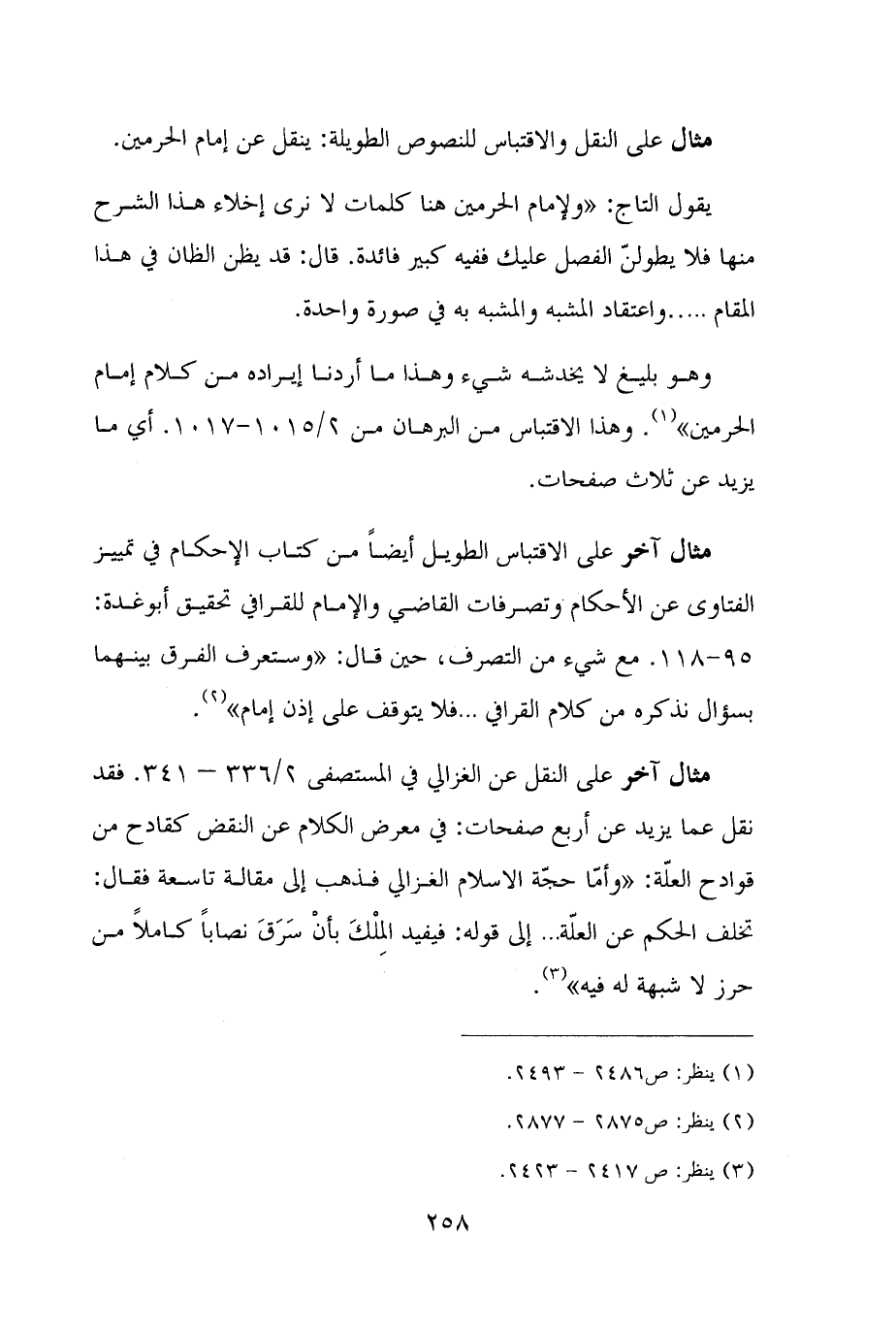 مثال على النقل والاقتباس للنصوص الطويلة: ينقل عن إمام الحرمين.