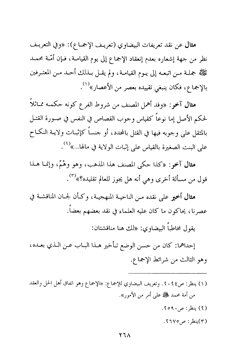 مثال عن نقد تعريفات البيضاوي (تعريف الإجماع): "وفي التعريف نظر من جهة إشعاره بعدم إنعقاد الإجماع إلى يوم القيامة، فإن أمّة محمد - صلى الله عليه وسلم - جملة من اتبعه إلى يوم القيامة، ولم يقل بذلك أحد من المعترفين بالإجماع، فكان ينبغي تقييده بعصر من الأعصار" (¬١).