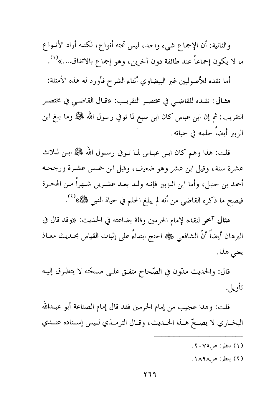 مثال: نقده للقاضي في مختصر التقريب: "قال القاضي في مختصر التقريب: ثم إن ابن عباس كان ابن سبع لما توفي رسول الله - صلى الله عليه وسلم - وما بلغ ابن الزبير أيضًا حلمه في حياته.