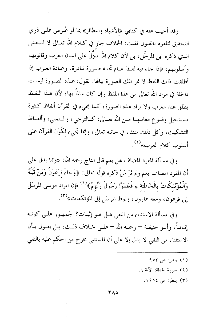 وقد أجيب عنه في كتابي "الأشباه والنظائر" بما لو عُرض على ذوي التحقيق لتلقوه بالقبول فقلت: الخلاف جارٍ في كلام الله تعالى لا للمعنى الذي ذكره ابن المرحِّل، بل لأن كلام الله منزَّلٌ على لسان العرب وقانونهم وأسلوبهم، فإذا جاء فيه لفظ عام تحته صورة نادرة، وعادة العرب إذا أطلقت ذلك اللفظ لا تمر تلك الصورة ببالها. نقول: هذه الصورة ليست داخلة في مراد الله تعالى من هذا اللفظ وإن كان عالمًا بها؛ لأن هذا اللفظ يطلق عند العرب ولا يراد هذه الصورة، كما يجيء في القرآن ألفاظ كثيرة يستحيل وقوع معانيها من الله تعالى: كالترجي، والتمني، وألفاظ التشكيك، وكل ذلك منتف في جانبه تعالى، وإنما تجيء لِكَوْن القرآن على أسلوب كلام العرب" (¬١).