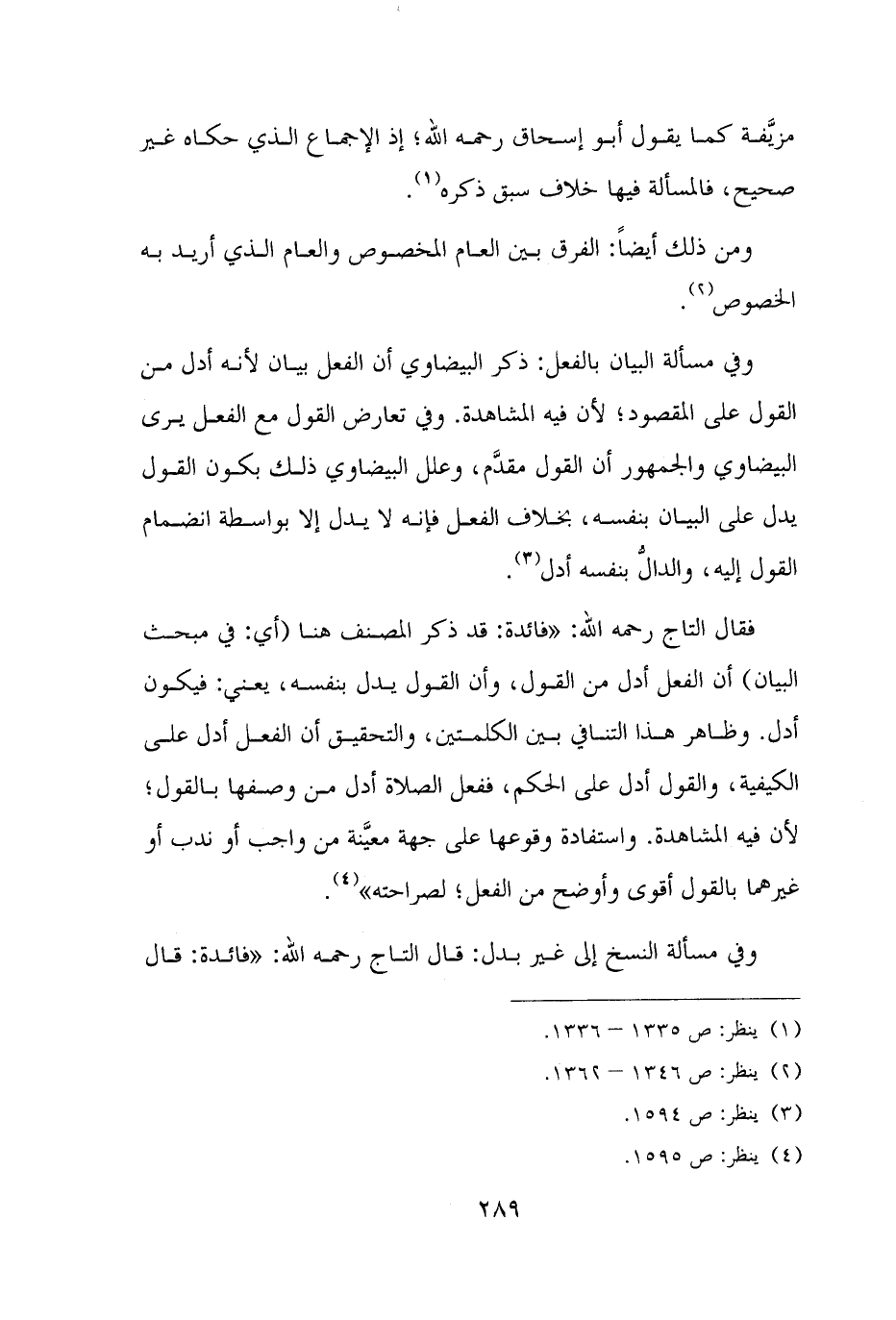 وفي مسألة البيان بالفعل: ذكر البيضاوي أن الفعل بيان لأنه أدل من القول على المقصود؛ لأن فيه المشاهدة. وفي تعارض القول مع الفعل يرى البيضاوي والجمهور أن القول مقدَّم، وعلل البيضاوي ذلك بكون القول يدل على البيان بنفسه، بخلاف الفعل فإنه لا يدل إلا بواسطة انضمام القول إليه، والدالُّ بنفسه أدل (¬٣).