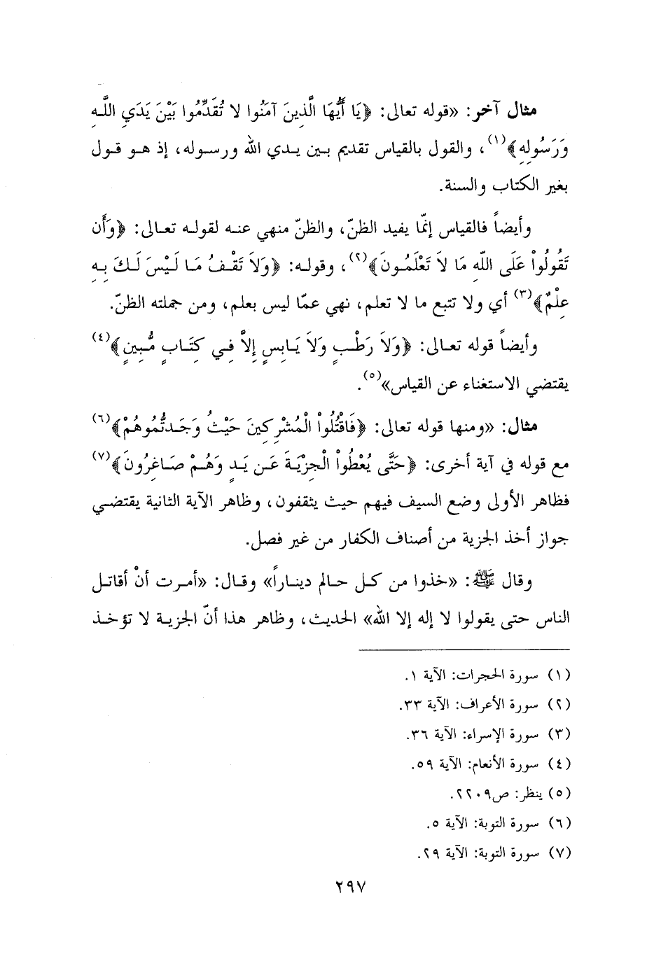 مثال آخر: "قوله تعالى: {يَاأَيُّهَا الَّذِينَ آمَنُوا لَا تُقَدِّمُوا بَيْنَ يَدَيِ اللَّهِ وَرَسُولِهِ} (¬١)، والقول بالقياس تقديم بين يدي الله ورسوله، إذ هو قول بغير الكتاب والسنة.