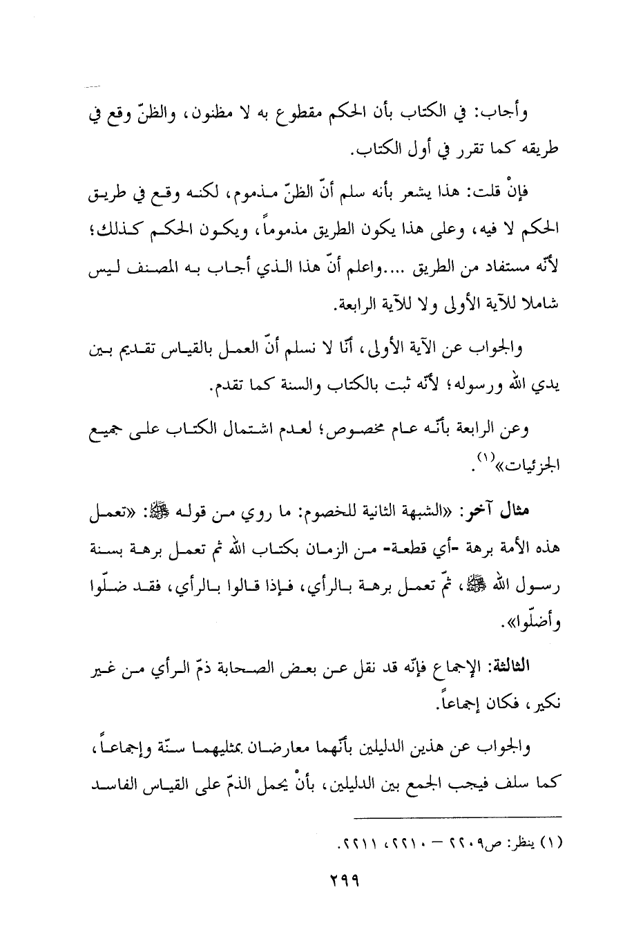 مثال آخر: "الشبهة الثانية للخصوم: ما روي من قوله - صلى الله عليه وسلم -: "تعمل هذه الأمة برهة - أي قطعة - من الزمان بكتاب الله ثم تعمل برهة بسنة رسول الله - صلى الله عليه وسلم -، ثمّ تعمل برهة بالرأي، فإذا قالوا بالرأي، فقد ضلّوا وأضلّوا".