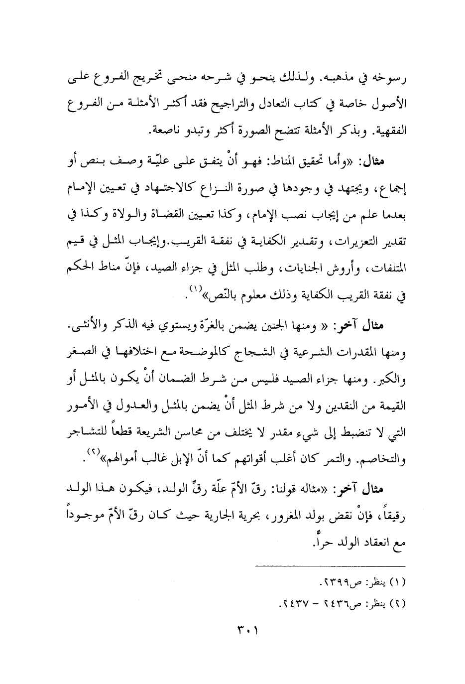 مثال آخر: "مثاله قولنا: رقّ الأمّ علّة رقّ الولد، فيكون هذا الولد رقيقًا، فإنْ نقض بولد المغرور، بحرية الجارية حيث كان رقّ الأمّ موجودًا مع انعقاد الولد حرًّا.