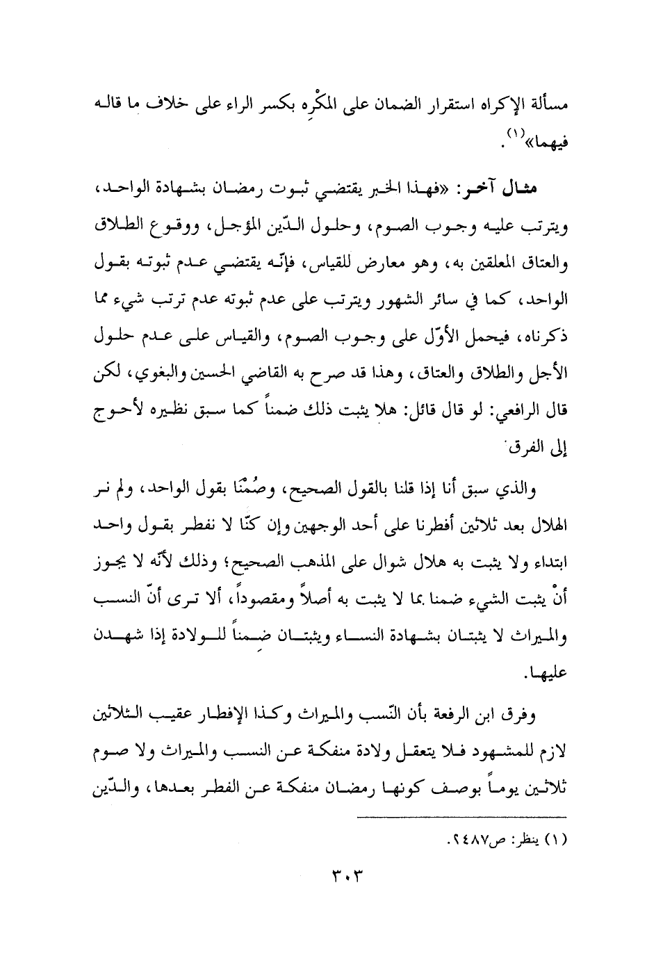 مثال آخر: "فهذا الخبر يقتضي ثبوت رمضان بشهادة الواحد، ويترتب عليه وجوب الصوم، وحلول الدّين المؤجل، ووقوع الطلاق والعتاق المعلقين به، وهو معارض للقياس، فإنّه يقتضي عدم ثبوته بقول الواحد، كما في سائر الشهور ويترتب على عدم ثبوته عدم ترتب شيء مما ذكرناه، فيحمل الأوّل على وجوب الصوم، والقياس على عدم حلول الأجل والطلاق والعتاق، وهذا قد صرح به القاضي الحسين والبغوي، لكن قال الرافعي: لو قال قائل: هلا يثبت ذلك ضمنًا كما سبق نظيره لأحوج إلى الفرق.