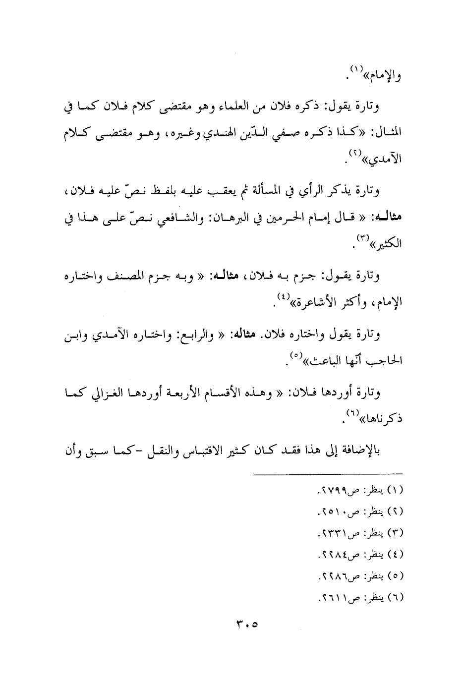 وتارة يقول: ذكره فلان من العلماء وهو مقتضى كلام فلان كما في المثال: "كذا ذكره صفي الدّين الهندي وغيره، وهو مقتضى كلام الآمدي" (¬٢).