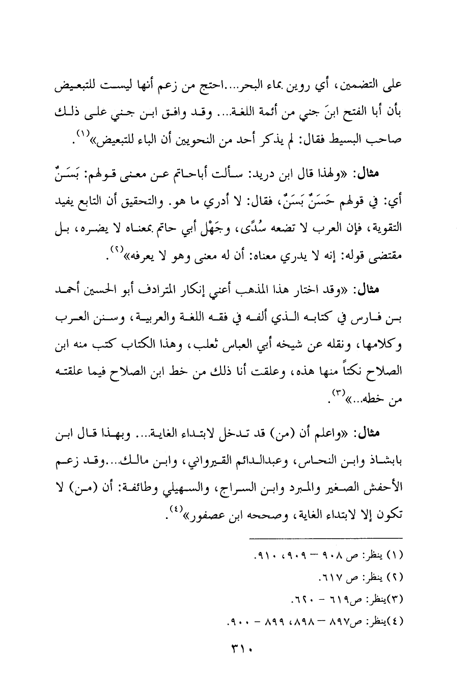 مثال: "ولهذا قال ابن دريد: سألت أبا حاتم عن معنى قولهم: بَسَنٌ أي: في قولهم حَسَنٌ بَسَنٌ، فقال: لا أدري ما هو. والتحقيق أن التابع يفيد التقوية، فإن العرب لا تضعه سُدًى، وجَهْل أبي حاتم بمعناه لا يضره، بل مقتضى قوله: إنه لا يدري معناه: أن له معنى وهو لا يعرفه" (¬٢).