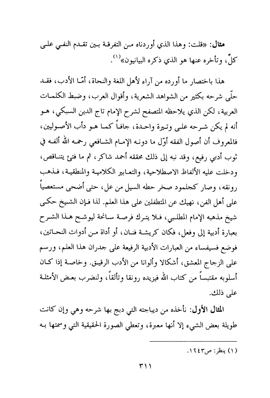 مثال: "قلت: وهذا الذي أوردناه من التفرقة بين تقدم النفي على كلَّ، وتأخره عنها هو الذي ذكره البيانيون" (¬١).