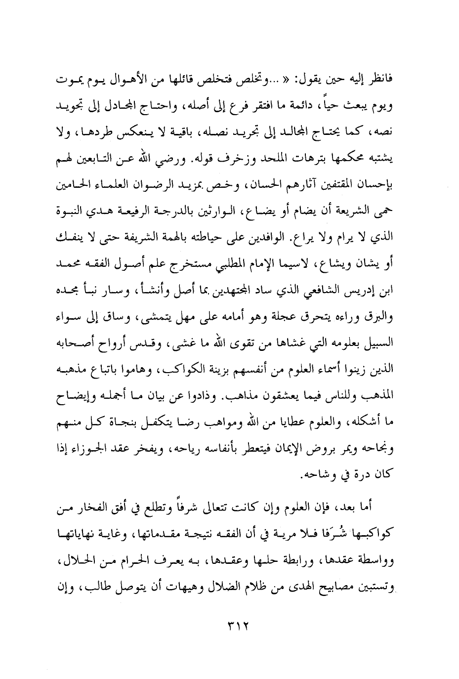 فانظر إليه حين يقول: ". . . وتخلص فتخلص قائلها من الأهوال يوم يموت ويوم يبعث حيًا، دائمة ما افتقر فرع إلى أصله، واحتاج المجادل إلى تجويد نصه، كما يحتاج المجالد إلى تجريد نصله، باقية لا ينعكس طردها، ولا يشتبه محكمها بترهات الملحد وزخرف قوله. ورضي الله عن التابعين لهم بإحسان المقتفين آثارهم الحسان، وخص بمزيد الرضوان العلماء الحامين حمى الشريعة أن يضام أو يضاع، الوارثين بالدرجة الرفيعة هدي النبوة الذي لا يرام ولا يراع. الوافدين على حياطته بالهمة الشريفة حتى لا ينفك أو يشان ويشاع، لا سيما الإمام المطلبي مستخرج علم أصول الفقه محمد بن إدريس الشافعي الذي ساد المجتهدين بما أصل وأنشأ، وسار نبأ مجده والبرق وراءه يتحرق عجلة وهو أمامه على مهل يتمشى، وساق إلى سواء السبيل بعلومه التي غشاها من تقوى الله ما غشى، وقدس أرواح أصحابه الذين زينوا أسماء العلوم من أنفسهم بزينة الكواكب، وهاموا باتباع مذهبه المذهب وللناس فيما يعشقون مذاهب. وذادوا عن بيان ما أجمله وإيضاح ما أشكله، والعلوم عطايا من الله ومواهب رضا يتكفل بنجاة كل منهم ونجاحه ويمر بروض الإيمان فيتعطر بأنفاسه رياحه، ويفخر عقد الجوزاء إذا كان درة في وشاحه.