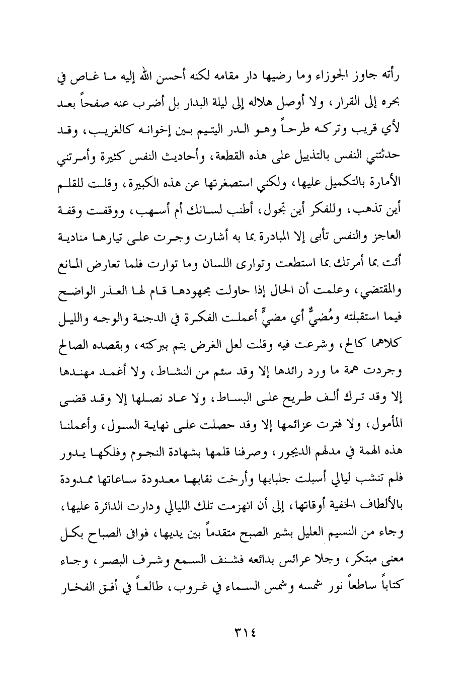 رأته جاوز الجوزاء وما رضيها دار مقامه لكنه أحسن الله إليه ما غاص في بحره إلى القرار، ولا أوصل هلاله إلى ليلة البدار بل أضرب عنه صفحًا بعد لأي قريب وتركه طرحًا وهو الدر اليتيم بين إخوانه كالغريب، وقد حدثتني النفس بالتذييل على هذه القطعة، وأحاديث النفس كثيرة وأمرتني الأمارة بالتكميل عليها، ولكني استصغرتها عن هذه الكبيرة، وقلت للقلم أين تذهب، وللفكر أين تجول، أطنب لسانك أم أسهب، ووقفت وقفة العاجز والنفس تأبى إلا المبادرة بما به أشارت وجرت على تيارها منادية أئت بما أمرتك بما استطعت وتوارى اللسان وما توارت فلما تعارض المانع والمقتضي، وعلمت أن الحال إذا حاولت مجهودها قام لها العذر الواضح فيما استقبلته ومُضيٌّ أي مضيٍّ أعملت الفكرة في الدجنة والوجه والليل كلاهما كالح، وشرعت فيه وقلت لعل الغرض يتم ببركته، وبقصده الصالح وجردت همة ما ورد رائدها إلا وقد سئم من النشاط، ولا أغمد مهندها إلا وقد ترك ألف طريح على البساط، ولا عاد نصلها إلا وقد قضى المأمول، ولا فترت عزائمها إلا وقد حصلت على نهاية السول، وأعملنا هذه الهمة في مدلهم الديجور، وصرفنا قلمها بشهادة النجوم وفلكها يدور فلم تنشب ليالي أسبلت جلبابها وأرخت نقابها معدودة ساعاتها ممدودة بالألطاف الخفية أوقاتها، إلى أن انهزمت تلك الليالي ودارت الدائرة عليها، وجاء من النسيم العليل بشير الصبح متقدمًا بين يديها، فوافى الصباح بكل معنى مبتكر، وجلا عرائس بدائعه فشنف السمع وشرف البصر، وجاء كتابًا ساطعًا نور شمسه وشمس السماء في غروب، طالعًا في أفق الفخار