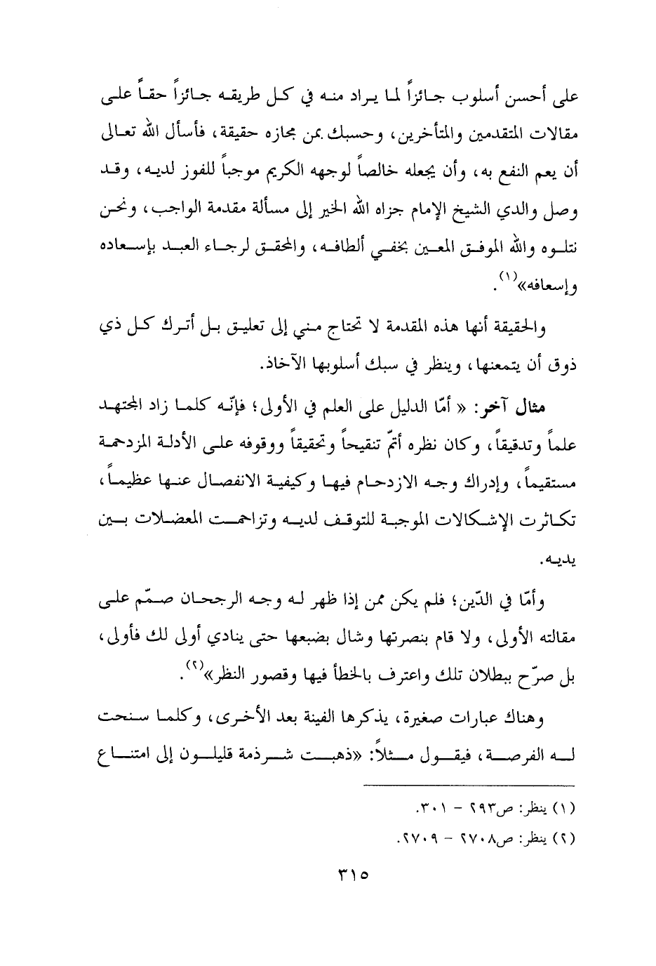 مثال آخر: "أمّا الدليل على العلم في الأولى؛ فإنّه كلما زاد المجتهد علمًا وتدقيقًا، وكان نظره أتمّ تنقيحًا وتحقيقًا ووقوفه على الأدلة المزدحمة مستقيمًا، وإدراك وجه الازدحام فيها وكيفية الانفصال عنها عظيمًا، تكاثرت الإشكالات الموجبة للتوقف لديه وتزاحمت المعضلات بين يديه.