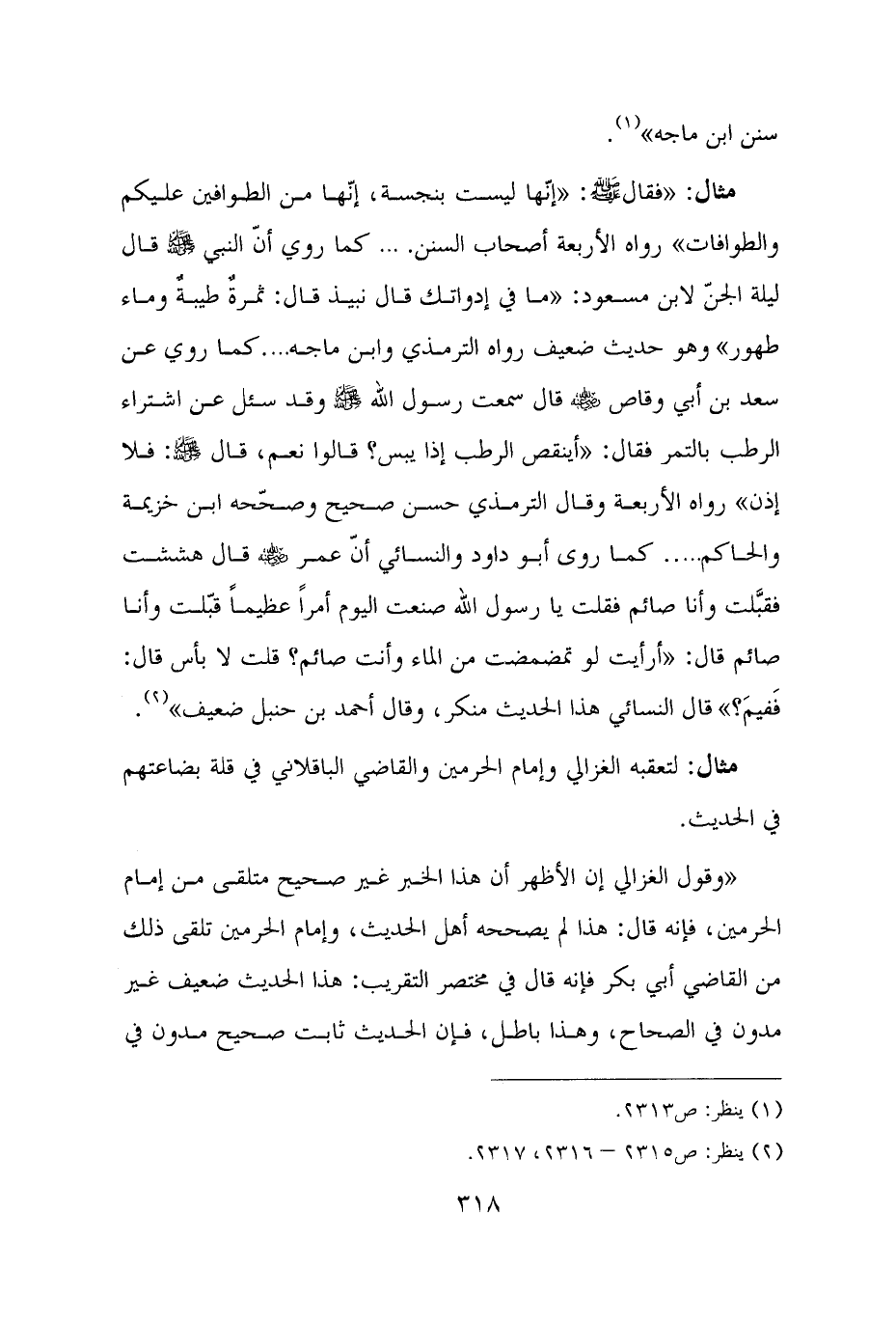 مثال: "فقال - صلى الله عليه وسلم -: "إنّها ليست بنجسة، إنّها من الطوافين عليكم والطوافات" رواه الأربعة أصحاب السنن. . . . كما روي أنّ النبي - صلى الله عليه وسلم - قال ليلة الجنّ لابن مسعود: "ما في إدواتك قال نبيذ قال: ثمرةٌ طيبةٌ وماء طهور" وهو حديث ضعيف رواه الترمذي وابن ماجه. . . . كما روي عن سعد بن أبي وقاص - رضي الله عنه - قال سمعت رسول الله - صلى الله عليه وسلم - وقد سئل عن اشتراء الرطب بالتمر فقال: "أينقص الرطب إذا يبس؟ قالوا نعم، قال - صلى الله عليه وسلم -: فلا إذن" رواه الأربعة وقال الترمذي حسن صحيح وصحّحه ابن خزيمة والحاكم. . . . . كما روى أبو داود والنسائي أنّ عمر - رضي الله عنه - قال هششت فقبَّلت وأنا صائم فقلت يا رسول الله صنعت اليوم أمرًا عظيمًا قبّلت وأنا صائم قال: "أرأيت لو تمضمضت من الماء وأنت صائم؟ قلت لا بأس قال: فَفيمَ؟ " قال النسائي هذا الحديث منكر، وقال أحمد بن حنبل ضعيف" (¬٢).