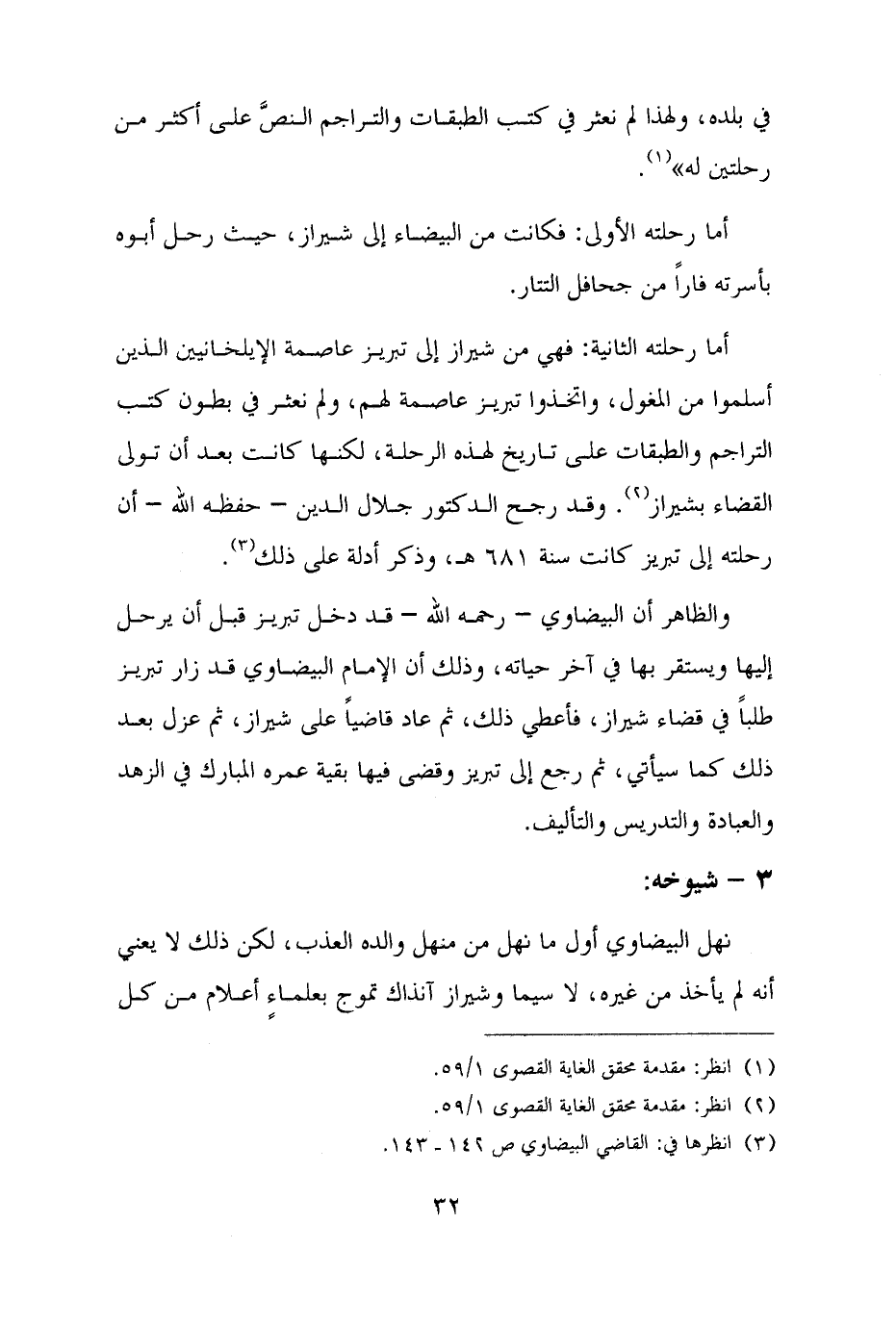 أما رحلته الثانية: فهي من شيراز إلى تبريز عاصمة الإيلخانيين الذين أسلموا من المغول، واتخذوا تبريز عاصمة لهم، ولم نعثر في بطون كتب التراجم والطبقات على تاريخ لهذه الرحلة، لكنها كانت بعد أن تولى القضاء بشيراز (¬٢). وقد رجح الدكتور جلال الدين - حفظه الله - أن رحلته إلى تبريز كانت سنة ٦٨١ هـ، وذكر أدلة على ذلك (¬٣).