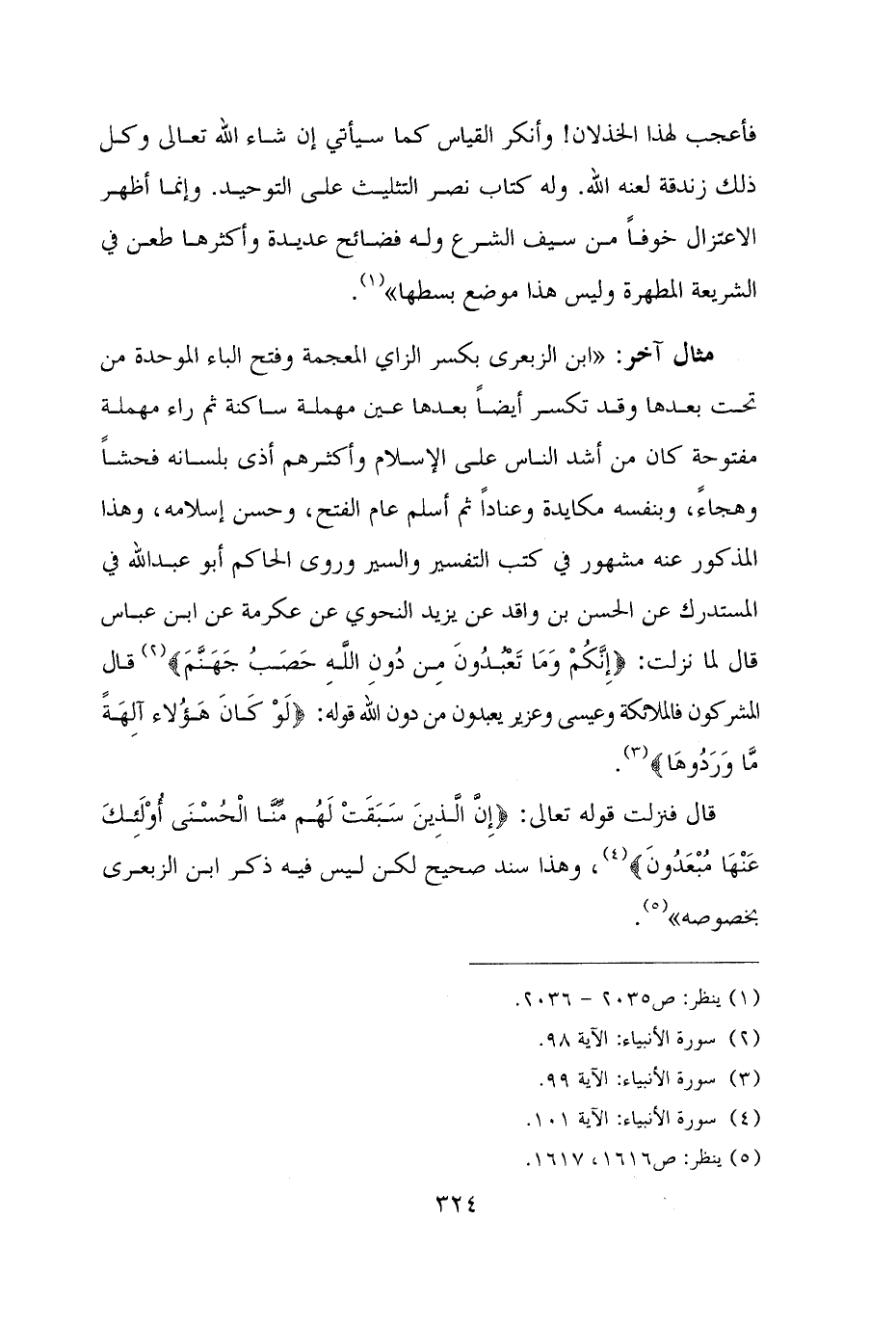 مثال آخر: "ابن الزبعرى بكسر الزاي المعجمة وفتح الباء الموحدة من تحت بعدها وقد تكسر أيضًا بعدها عين مهملة ساكنة ثم راء مهملة مفتوحة كان من أشد الناس على الإسلام وأكثرهم أذى بلسانه فحشًا وهجاءً، وبنفسه مكايدة وعنادًا ثم أسلم عام الفتح، وحسن إسلامه، وهذا المذكور عنه مشهور في كتب التفسير والسير وروى الحاكم أبو عبد الله في المستدرك عن الحسن بن واقد عن يزيد النحوي عن عكرمة عن ابن عباس قال لما نزلت: {إِنَّكُمْ وَمَا تَعْبُدُونَ مِنْ دُونِ اللَّهِ حَصَبُ جَهَنَّمَ} (¬٢) قال المشركون فالملائكة وعيسى وعزير يعبدون من دون الله قوله: {لَوْ كَانَ هَؤُلَاءِ آلِهَةً مَا وَرَدُوهَا} (¬٣).