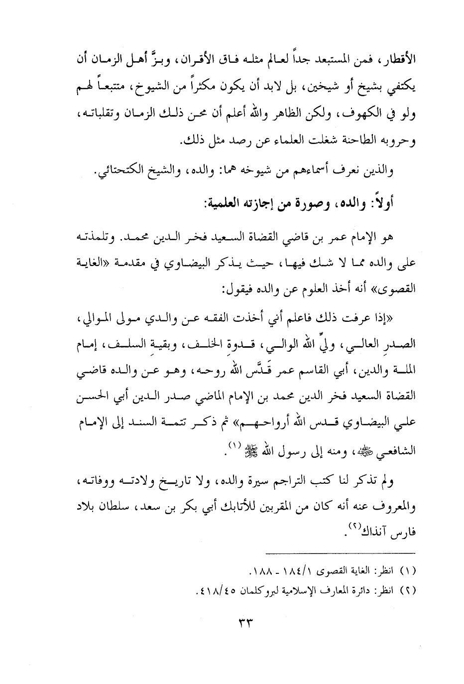 "إذا عرفت ذلك فاعلم أني أخذت الفقه عن والدي مولى الموالي، الصدرِ العالي، وليِّ الله الوالي، قدوةِ الخلف، وبقيةِ السلف، إمام الملة والدين، أبي القاسم عمر قَدَّس الله روحه، وهو عن والده قاضي القضاة السعيد فخر الدين محمد بن الإمام الماضي صدر الدين أبي الحسن علي البيضاوي قدس الله أرواحهم" ثم ذكر تتمة السند إلى الإمام الشافعي - رضي الله عنه -، ومنه إلى رسول الله - صلى الله عليه وسلم - (¬١).