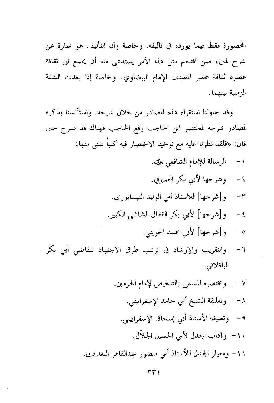 وقد حاولنا استقراء هذه المصادر من خلال شرحه. واستأنسنا بذكره لمصادر شرحه لمختصر ابن الحاجب رفع الحاجب فهناك قد صرح حين قال: "فلقد نظرنا عليه مع توخينا الاختصار فيه كتبًا شتى منها: