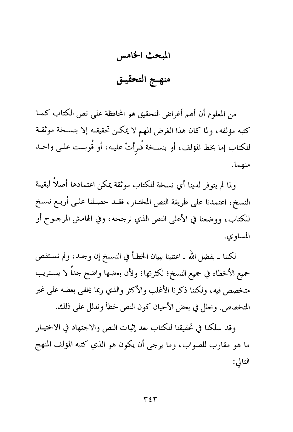 ولما لم يتوفر لدينا أي نسخة للكتاب موثقة يمكن اعتمادها أصلًا لبقية النسخ، اعتمدنا على طريقة النص المختار، فقد حصلنا على أربع نسخ للكتاب، ووضعنا في الأعلى النص الذي نرجحه، وفي الهامش المرجوح أو المساوي.