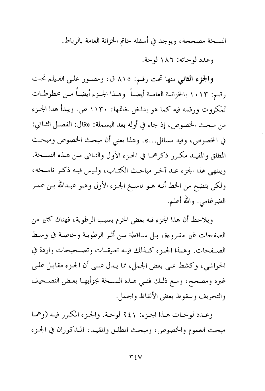 والجزء الثاني منها تحت رقم: ٨١٥ ق، ومصور على الفيلم تحت رقم: ١٠١٣ بالخزانة العامة أيضًا. وهذا الجزء أيضًا من مخطوطات تَمَكروت ورقمه فيه كما هو بداخل خاتمها: ١١٣٠ ص. ويبدأ هذا الجزء من مبحث الخصوص، إذ جاء في أوله بعد البسملة: "قال: الفصل الثاني: في الخصوص، وفيه مسائل. . .". وهذا يعني أن مبحث الخصوص ومبحث المطلق والمقيد مكرر ذكرهما في الجزء الأول والثاني من هذه النسخة. وينتهي هذا الجزء عند آخر مباحث الكتاب، وليس فيه ذكر ناسخه، ولكن يتضح من الخط أنه هو ناسخ الجزء الأول وهو عبد الله بن عمر الضرغامي. والله أعلم.