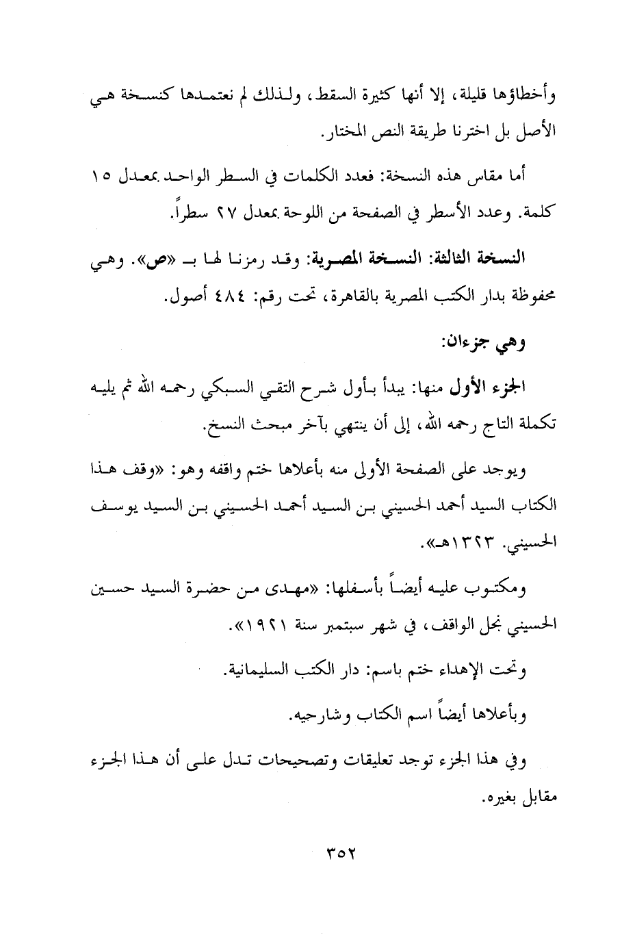 الجزء الأول منها: يبدأ بأول شرح التقي السبكي رحمه الله ثم يليه تكملة التاج رحمه الله، إلى أن ينتهى بآخر مبحث النسخ.