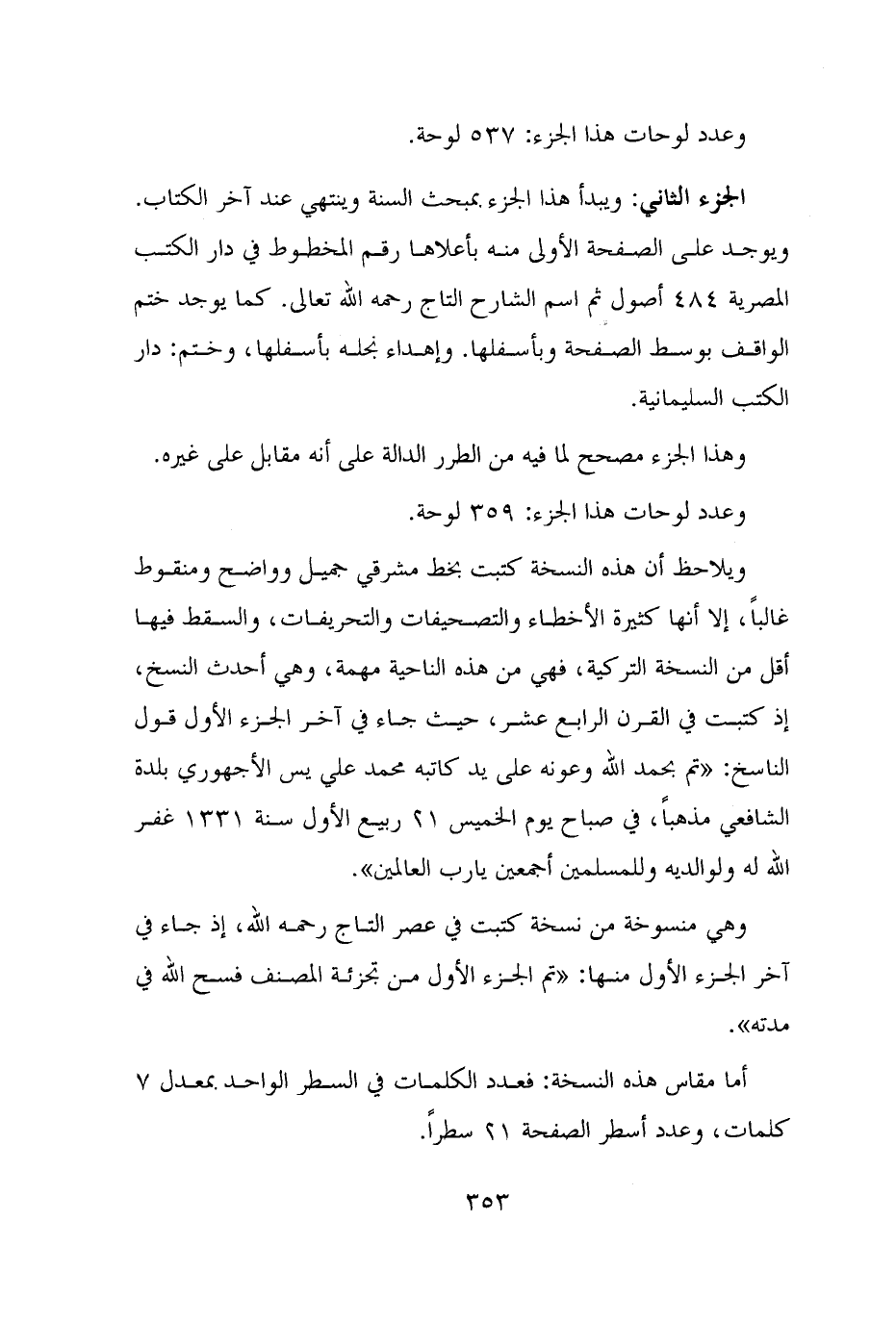 الجزء الثاني: ويبدأ هذا الجزء بمبحث السنة وينتهي عند آخر الكتاب. ويوجد على الصفحة الأولى منه بأعلاها رقم المخطوط في دار الكتب المصرية ٤٨٤ أصول ثم اسم الشارح التاج رحمه الله تعالى. كما يوجد ختم الواقف بوسط الصفحة وبأسفلها. وإهداء نجله بأسفلها، وختم: دار الكتب السليمانية.