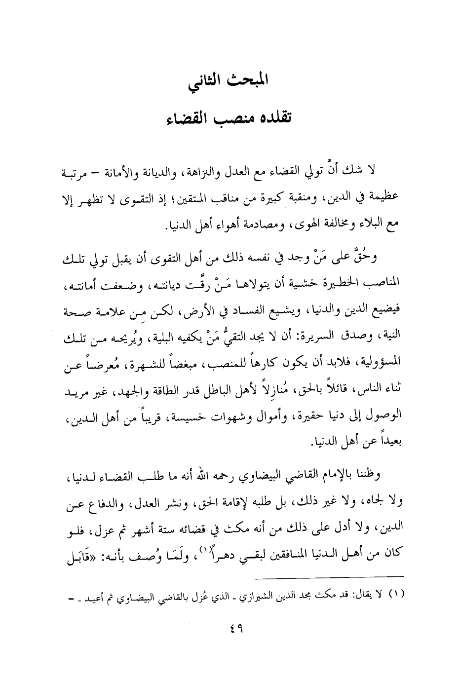 وظننا بالإمام القاضي البيضاوي رحمه الله أنه ما طلب القضاء لدنيا، ولا لجاه، ولا غير ذلك، بل طلبه لإقامة الحق، ونشر العدل، والدفاع عن الدين، ولا أدل على ذلك من أنه مكث في قضائه ستة أشهر ثم عزل، فلو كان من أهل الدنيا المنافقين لبقي دهرًا (¬١)، ولَمَا وُصف بأنه: "قَابَل