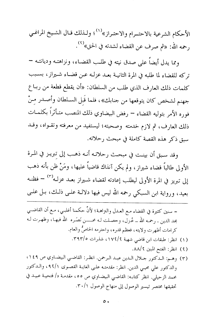وقد سبق أن بينت في مبحث رحلاته أنه ذهب إلى تبريز في المرة الأولى طالبًا قضاء شيراز، ولم يكن آنذاك قاضيًا عليها، ومَنْ ظن بأنه ذهب إلى تبريز في المرة الأولى ليطلب إعادته لقضاء شيراز بعد عزله (¬٣) - فظنه بعيد، ورواية ابن السبكي رحمه الله ليس فيها دلالة على ذلك، بل على