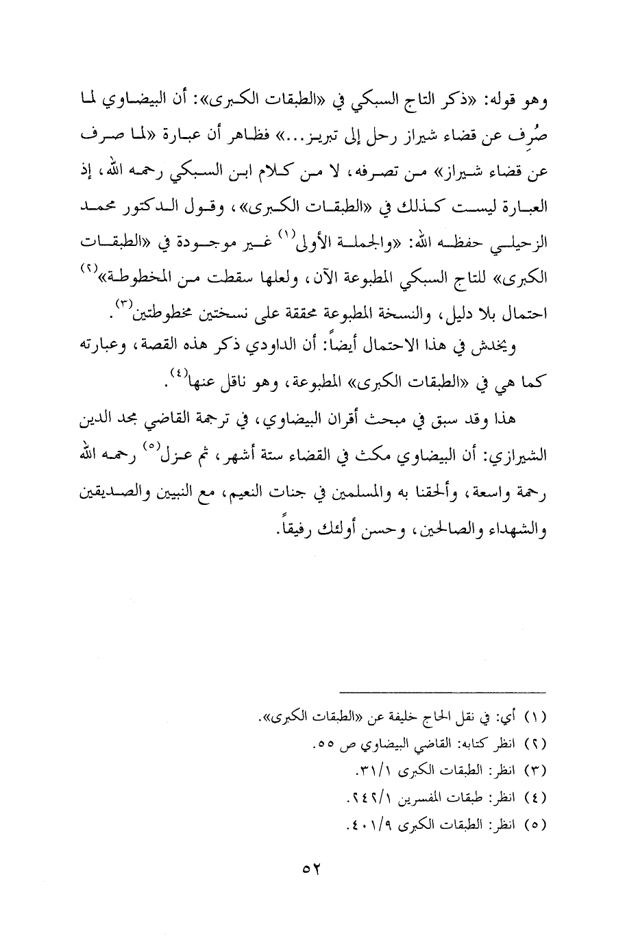 وهو قوله: "ذكر التاج السبكي في "الطبقات الكبرى": أن البيضاوي لما صُرِف عن قضاء شيراز رحل إلى تبريز. . ." فظاهر أن عبارة "لما صرف عن قضاء شيراز" من تصرفه، لا من كلام ابن السبكي رحمه الله، إذ العبارة ليست كذلك في "الطبقات الكبرى"، وقول الدكتور محمد الزحيلي حفظه الله: "والجملة الأولى (¬١) غير موجودة في "الطبقات الكبرى" للتاج السبكي المطبوعة الآن، ولعلها سقطت من المخطوطة" (¬٢) احتمال بلا دليل، والنسخة المطبوعة محققة على نسختين مخطوطتين (¬٣).