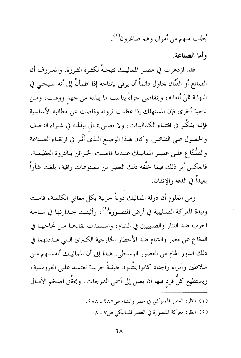 ومن المعلوم أن دولة المماليك دولةٌ حربية بكل معاني الكلمة، قامت وليدة المعركة الصليبية في أرض المنصورة (¬٢)، وأثبتت جدارتها في ساحة الحرب ضد التتار والصليبيين في الشام، واستمدت بقاءها من نجاحها في الدفاع عن مصر والشام ضد الأخطار الخارجية الكبرى التي هددتهما في ذلك الدور الهام من العصور الوسطى. هذا إلى أن المماليك أنفسهم من سلاطين وأمراء وأجناد كانوا يمثِّلون طبقةً حربية تعتمد على الفروسية، ويستطيع كلُّ فردٍ فيها أن يصل إلى أسمى الدرجات، ويحقِّق أضخم الآمال