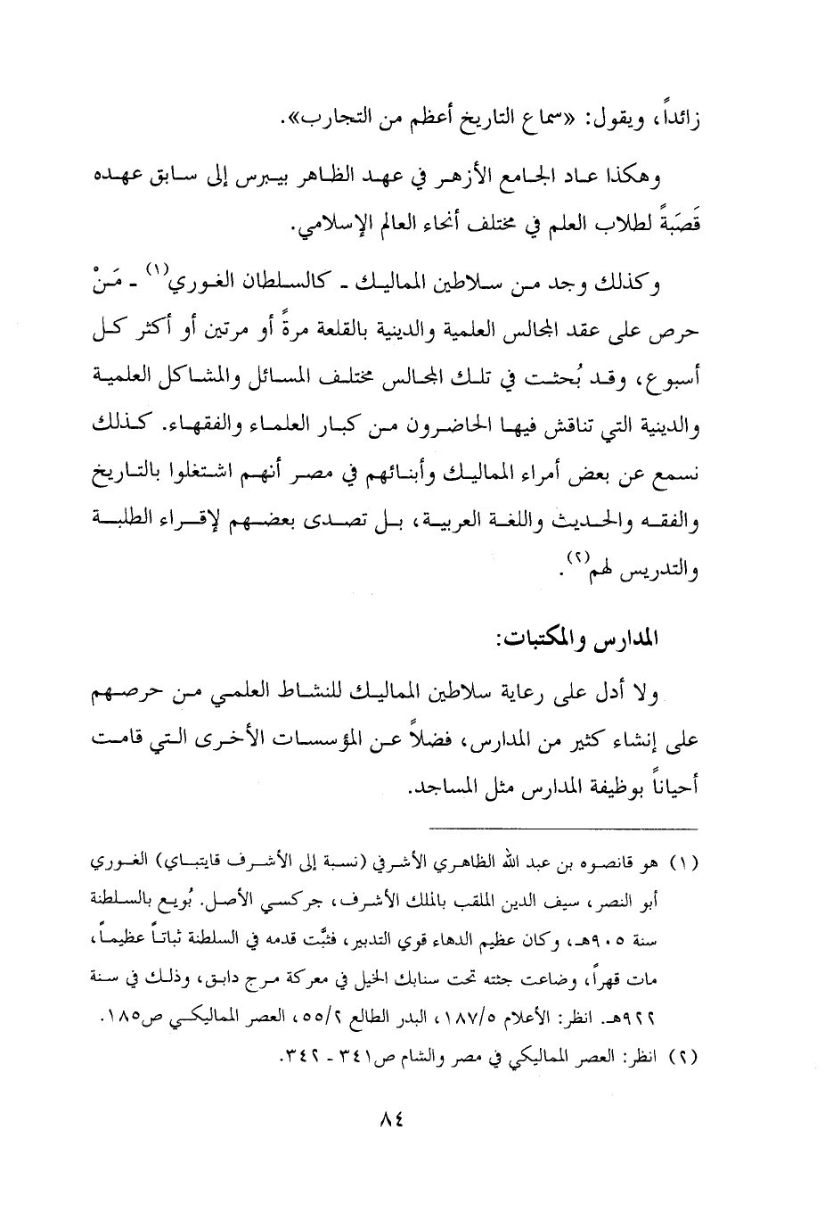 وكذلك وجد من سلاطين الماليك - كالسلطان الغوري (¬١) - مَنْ حرص على عقد المجالس العلمية والدينية بالقلعة مرةً أو مرتين أو أكثر كل أسبوع، وقد بُحثت في تلك المجالس مختلف المسائل والمشاكل العلمية والدينية التي تناقش فيها الحاضرون من كبار العلماء والفقهاء. كذلك نسمع عن بعض أمراء الماليك وأبنائهم في مصر أنهم اشتغلوا بالتاريخ والفقه والحديث واللغة العربية، بل تصدى بعضهم لإقراء الطلبة والتدريس لهم (¬٢).